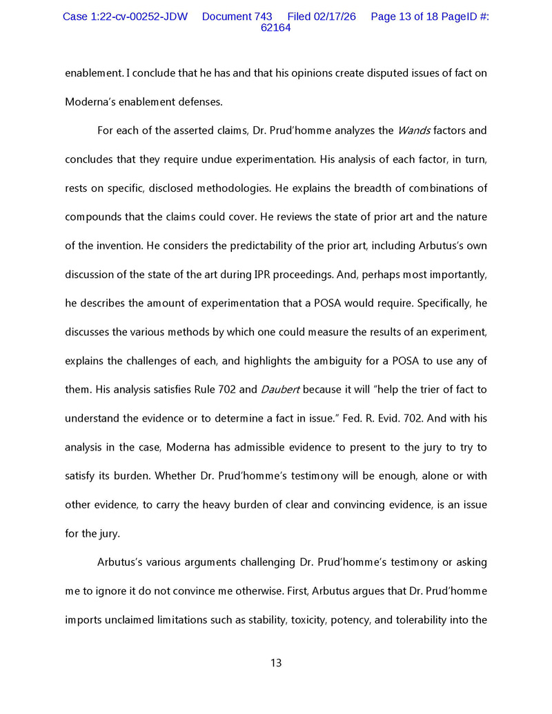 13 enablement. I conclude that he has and that his opinions create disputed issues of fact on Moderna’s enablement defenses. For each of the asserted claims, Dr . Prud’homme analyzes the Wands factors and concludes that they require undue experimentation . His analysis of each factor, in turn, rests on specific, disclosed methodologies . He explains the breadth of combinations of compounds that the claims could cover . He reviews the state of prior art and the nature of the invention . He considers the predictability of the prior art, including Arbutus’s own discussion of the state of the art during IPR proceedings . And, perhaps most importantly, he describes the amount of experimentation that a POSA would require . Specifically, he discusses the various methods by which one could measure the results of an experiment, explains the challenges of each, and highlights the ambiguity for a POSA to use any of them . His analysis satisfies Rule 702 and Daubert because it will “help the trier of fact to understand the evidence or to determine a fact in issue . ” Fed . R . Evid . 702 . And with his analysis in the case, Moderna has admissible evidence to present to the jury to try to satisfy its burden . Whether Dr . Prud’homme’s testimony will be enough, alone or with other evidence, to carry the heavy burden of clear and convincing evidence, is an issue for the jury . Arbutus’s various arguments challenging Dr . Prud’homme’s testimony or asking me to ignore it do not convince me otherwise . First, Arbutus argues that Dr . Prud’homme imports unclaimed limitations such as stability, toxicity, potency, and tolerability into the Case 1:22 - cv - 00252 - JDW Document 743 Filed 02/17/26 Page 13 of 18 PageID #: 62164