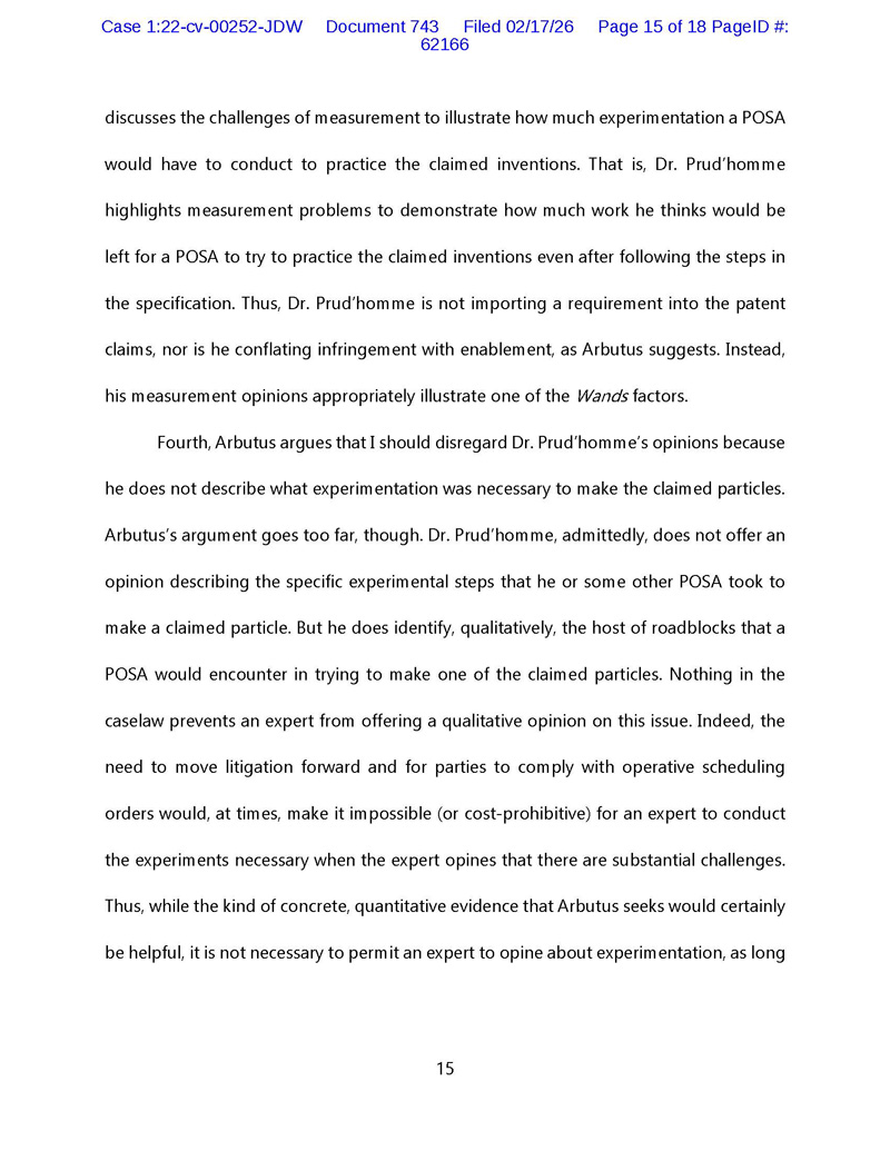 15 discusses the challenges of measurement to illustrate how much experimentation a POSA would have to conduct to practice the claimed inventions . That is, Dr . Prud’homme highlights measurement problems to demonstrate how much work he thinks would be left for a POSA to try to practice the claimed inventions even after following the steps in the specification . Thus, Dr . Prud’homme is not importing a requirement into the patent claims, nor is he conflating infringement with enablement, as Arbutus suggests . Instead, his measurement opinions appropriately illustrate one of the Wands factors . Fourth, Arbutus argues that I should disregard Dr . Prud’homme’s opinions because he does not describe what experimentation was necessary to make the claimed particles . Arbutus’s argument goes too far, though . Dr . Prud’homme, admittedly, does not offer an opinion describing the specific experimental steps that he or some other POSA took to make a claimed particle . But he does identify, qualitatively, the host of roadblocks that a POSA would encounter in trying to make one of the claimed particles . Nothing in the caselaw prevents an expert from offering a qualitative opinion on this issue . Indeed, the need to move litigation forward and for parties to comply with operative scheduling orders would, at times, make it impossible (or cost - prohibitive) for an expert to conduct the experiments necessary when the expert opines that there are substantial challenges . Thus, while the kind of concrete, quantitative evidence that Arbutus seeks would certainly be helpful, it is not necessary to permit an expert to opine about experimentation, as long Case 1:22 - cv - 00252 - JDW Document 743 Filed 02/17/26 Page 15 of 18 PageID #: 62166