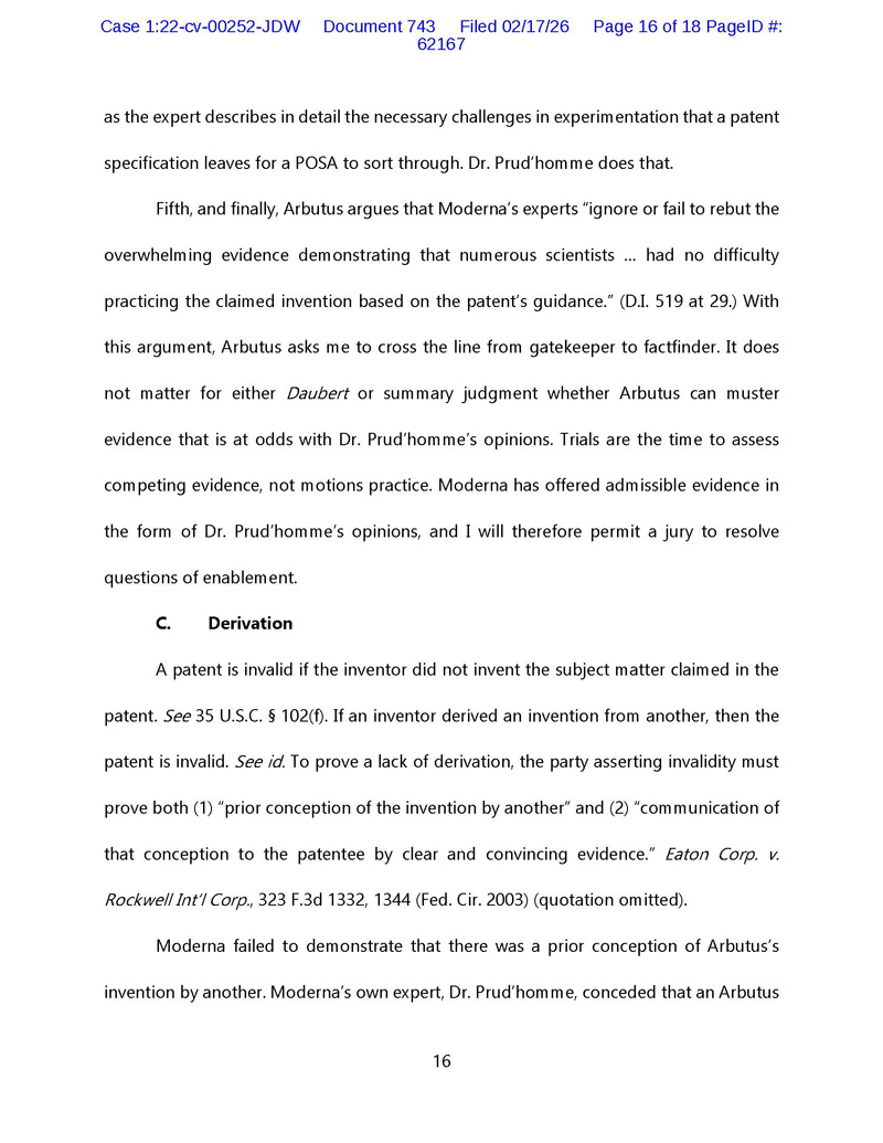16 as the expert describes in detail the necessary challenges in experimentation that a patent specification leaves for a POSA to sort through. Dr. Prud’homme does that. Fifth, and finally, Arbutus argues that Moderna’s experts “ignore or fail to rebut the overwhelming evidence demonstrating that numerous scientists … had no difficulty practicing the claimed invention based on the patent’s guidance . ” (D . I . 519 at 29 . ) With this argument, Arbutus asks me to cross the line from gatekeeper to factfinder . It does not matter for either Daubert or summary judgment whether Arbutus can muster evidence that is at odds with Dr . Prud’homme’s opinions . Trials are the time to assess competing evidence, not motions practice . Moderna has offered admissible evidence in the form of Dr . Prud’homme’s opinions, and I will therefore permit a jury to resolve questions of enablement . C. Derivation A patent is invalid if the inventor did not invent the subject matter claimed in the patent . See 35 U . S . C . † 102 (f) . If an inventor derived an invention from another, then the patent is invalid . See id . To prove a lack of derivation, the party asserting invalidity must prove both ( 1 ) “prior conception of the invention by another” and ( 2 ) “communication of that conception to the patentee by clear and convincing evidence . ” Eaton Corp . v . Rockwell Int’l Corp . , 323 F . 3 d 1332 , 1344 (Fed . Cir . 2003 ) (quotation omitted) . Moderna failed to demonstrate that there was a prior conception of Arbutus’s invention by another . Moderna’s own expert, Dr . Prud’homme, conceded that an Arbutus Case 1:22 - cv - 00252 - JDW Document 743 Filed 02/17/26 Page 16 of 18 PageID #: 62167