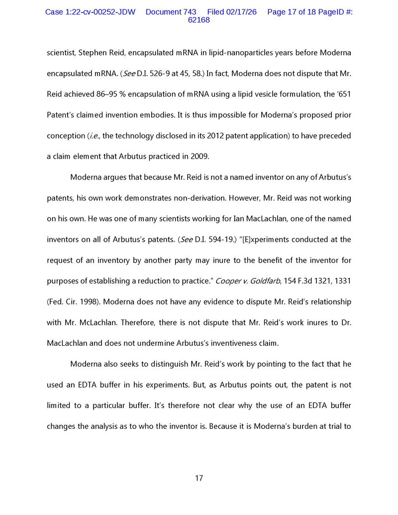 17 scientist, Stephen Reid, encapsulated mRNA in lipid - nanoparticles years before Moderna encapsulated mRNA . ( See D . I . 526 - 9 at 45 , 58 . ) In fact, Moderna does not dispute that Mr . Reid achieved 86 – 95 % encapsulation of mRNA using a lipid vesicle formulation, the ‘ 651 Patent’s claimed invention embodies . It is thus impossible for Moderna’s proposed prior conception ( i . e . , the technology disclosed in its 2012 patent application) to have preceded a claim element that Arbutus practiced in 2009 . Moderna argues that because Mr . Reid is not a named inventor on any of Arbutus’s patents, his own work demonstrates non - derivation . However, Mr . Reid was not working on his own . He was one of many scientists working for Ian MacLachlan, one of the named inventors on all of Arbutus’s patents . ( See D . I . 594 - 19 . ) “[E]xperiments conducted at the request of an inventory by another party may inure to the benefit of the inventor for purposes of establishing a reduction to practice . ” Cooper v . Goldfarb , 154 F . 3 d 1321 , 1331 (Fed . Cir . 1998 ) . Moderna does not have any evidence to dispute Mr . Reid’s relationship with Mr . McLachlan . Therefore, there is not dispute that Mr . Reid’s work inures to Dr . MacLachlan and does not undermine Arbutus’s inventiveness claim . Moderna also seeks to distinguish Mr . Reid’s work by pointing to the fact that he used an EDTA buffer in his experiments . But, as Arbutus points out, the patent is not limited to a particular buffer . It’s therefore not clear why the use of an EDTA buffer changes the analysis as to who the inventor is . Because it is Moderna’s burden at trial to Case 1:22 - cv - 00252 - JDW Document 743 Filed 02/17/26 Page 17 of 18 PageID #: 62168