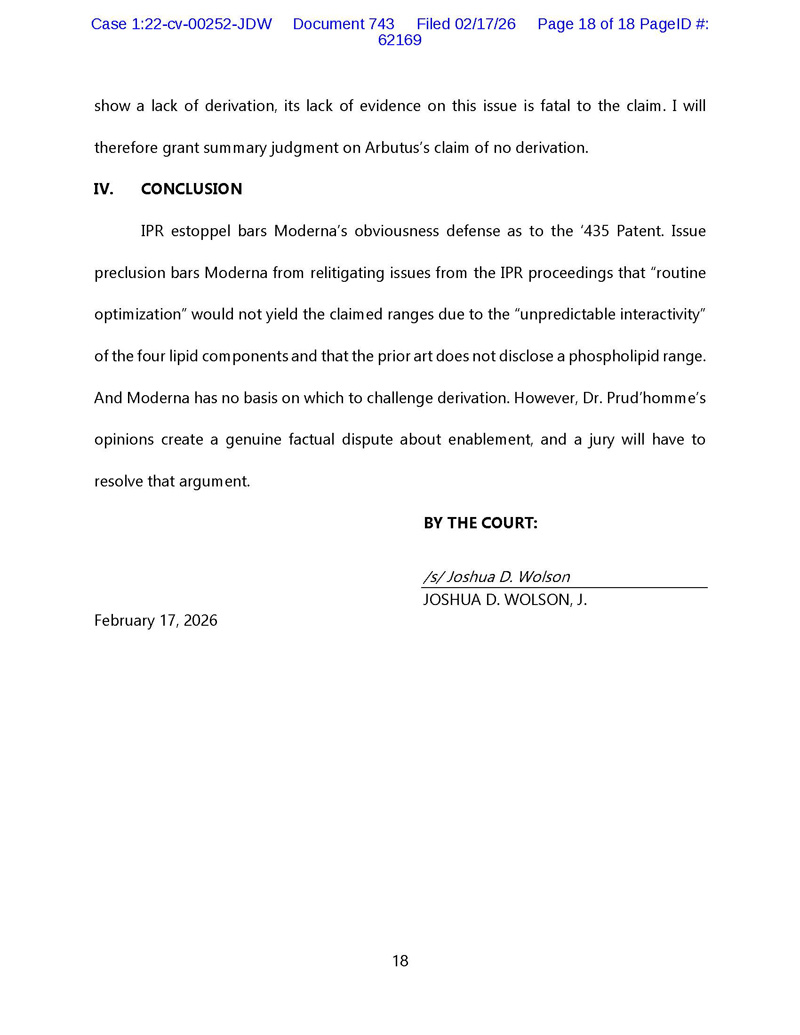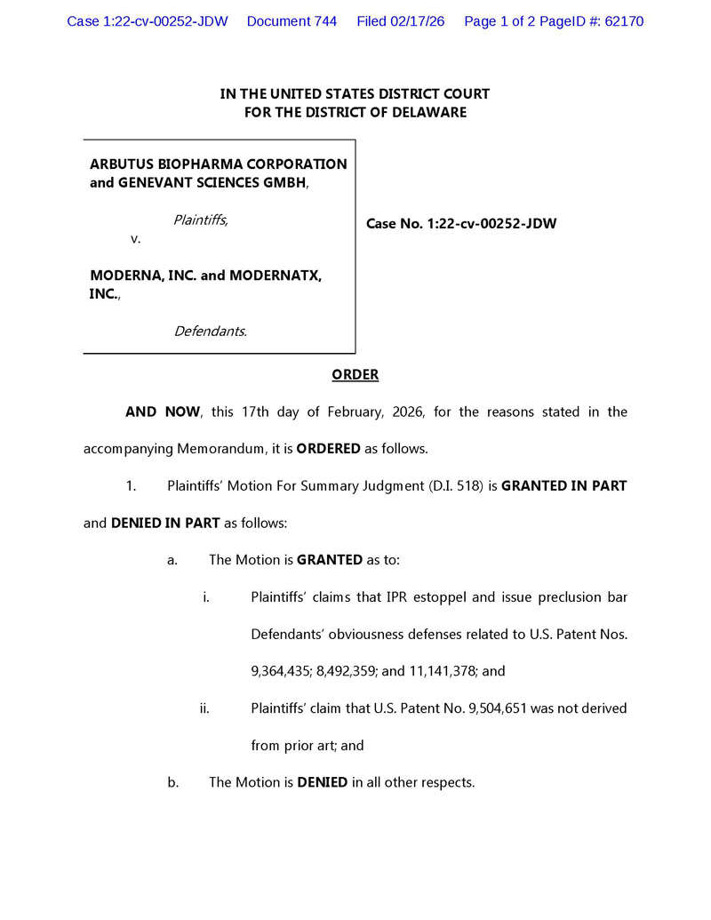 IN THE UNITED STATES DISTRICT COURT FOR THE DISTRICT OF DELAWARE Case No. 1:22 - cv - 00252 - JDW ORDER AND NOW , this 17th day of February, 2026, for the reasons stated in the accompanying Memorandum, it is ORDERED as follows. 1. Plaintiffs’ Motion For Summary Judgment (D.I. 518) is GRANTED IN PART and DENIED IN PART as follows: a. The Motion is GRANTED as to: i. Plaintiffs’ claims that IPR estoppel and issue preclusion bar Defendants’ obviousness defenses related to U . S . Patent Nos . 9 , 364 , 435 ; 8 , 492 , 359 ; and 11 , 141 , 378 ; and ii. Plaintiffs’ claim that U.S. Patent No. 9,504,651 was not derived from prior art; and b. The Motion is DENIED in all other respects. ARBUTUS BIOPHARMA CORPORATION and GENEVANT SCIENCES GMBH , Plaintiffs, v. MODERNA, INC. and MODERNATX, INC. , Defendants. Case 1:22 - cv - 00252 - JDW Document 744 Filed 02/17/26 Page 1 of 2 PageID #: 62170
