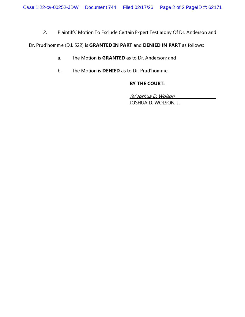 2. Plaintiffs’ Motion To Exclude Certain Expert Testimony Of Dr. Anderson and Dr. Prud’homme (D.I. 522) is GRANTED IN PART and DENIED IN PART as follows: a. The Motion is GRANTED as to Dr. Anderson; and b. The Motion is DENIED as to Dr. Prud’homme. BY THE COURT: /s/ Joshua D. Wolson JOSHUA D. WOLSON, J. Case 1:22 - cv - 00252 - JDW Document 744 Filed 02/17/26 Page 2 of 2 PageID #: 62171