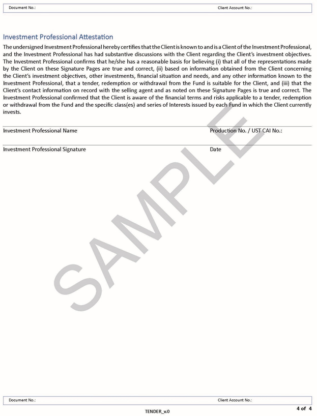 The Tender Offer Form generated for your account will need to be signed and returned to your FA in good order. Upon receiving signed documentation, your FA will submit the form for processing. Your FA must submit the form before 11:59 p.m., Eastern Time, on November 26, 2024. If you do not wish to have all or any portion of your Units repurchased, simply disregard this notice. NO ACTION IS REQUIRED IF YOU DO NOT WISH TO HAVE ANY OF YOUR UNITS REPURCHASED.