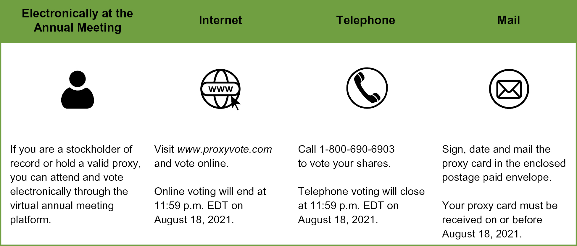 Due to the ongoing public health impact of the COVID-19 pandemic, this year’s annual meeting will be a virtual meeting conducted via live webcast. The annual meeting format will be a live audio webcast where you can view presentation materials made available online. There will be no physical in-person meeting. Additional information regarding attending the annual meeting, voting your shares and submitting questions in advance of the annual meeting can be found in the proxy statement.