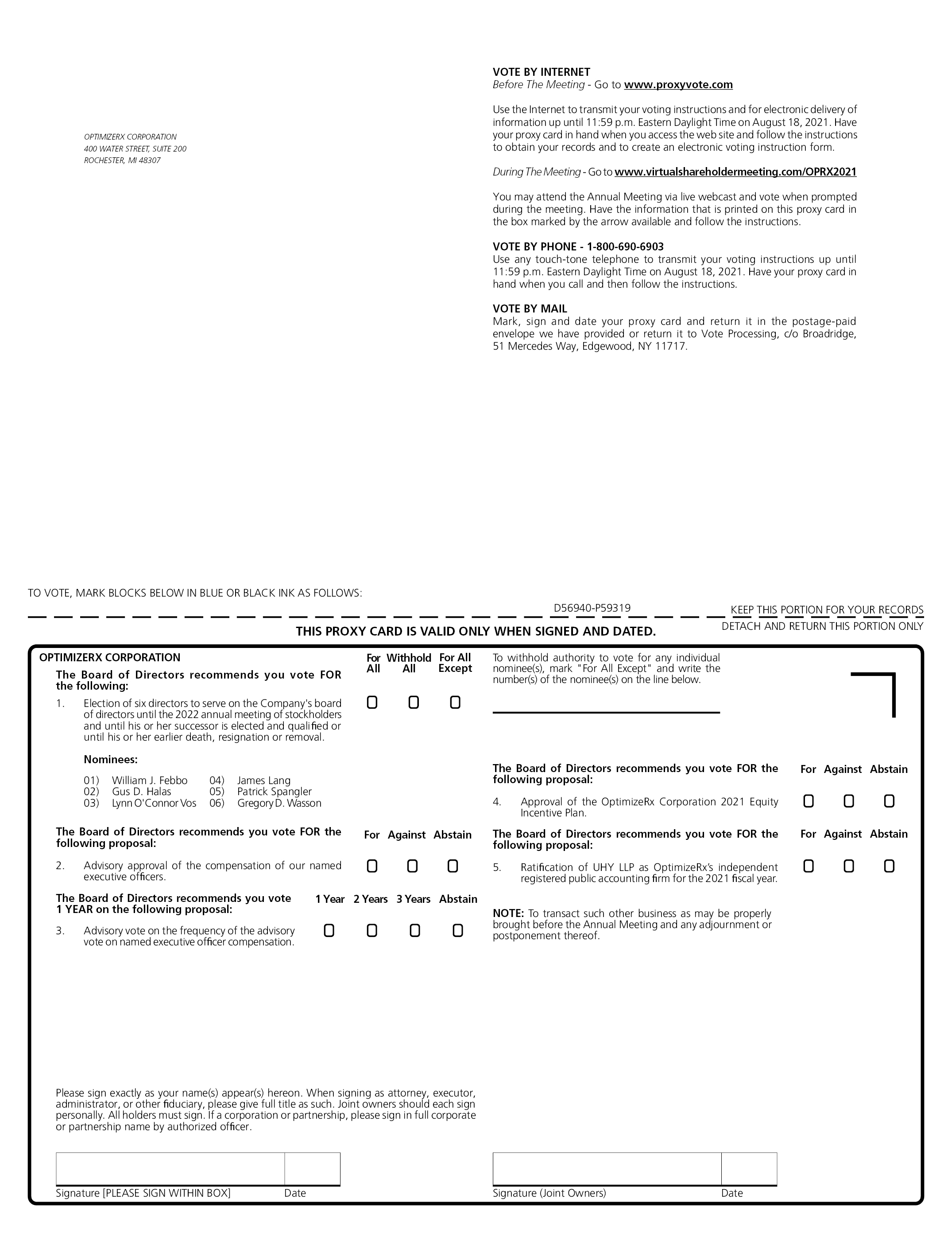 OPTIMIZERX CORPORATION 400 WATER STREET, SUITE 200 ROCHESTER, MI 48307 VOTE BY INTERNET Before The Meeting - Go to www.proxyvote.com Use the Internet to transmit your voting instructions and for electronic delivery of information up until 11:59 p.m. Eastern Daylight Time on August 18, 2021. Have your proxy card in hand when you access the web site and follow the instructions to obtain your records and to create an electronic voting instruction form. During The Meeting - Go to www.virtualshareholdermeeting.com/OPRX2021 You may attend the Annual Meeting via live webcast and vote when promoted during the meeting. Have the information that is printed on this proxy card in the box marked by the arrow available and follow the instructions. VOTE BY PHONE - 1-800-690-6903 Use any touch-tone telephone to transmit your voting instructions up until 11:59 p.m. Eastern Daylight Time on August 18, 2021. Have your proxy card in hand when you call and then follow the instructions. VOTE BY MAIL Mark, sign and date your proxy card and return it in the postage-paid envelope we have provided or return it to Vote Processing, c/o Broadridge, 51 Mercedes Way, Edgewood, NY 11717. TO VOTE, MARK BLOCKS BELOW IN BLUE OR BLACK INK AS FOLLOWS: D56940-P59319 KEEP THIS PORTION FOR YOUR RECORDS THIS PROXY CARD IS VALID ONLY WHEN SIGNED AND DATED. DETACH AND RETURN THIS PORTION ONLY OPTIMIZERX CORPORATION The Board of Directors recommends you vote FOR the following: 1. Election of six directors to serve on the Company’s board of directors until the 2022 annual meeting of stockholders and until his or her successor is elected and qualified or until his or her earlier death, resignation or removal. Nominees: 01) William J. Febbo 02) Gus D. Halas 03) Lynn O’Connor Vos 04) James Lang 05) Patrick Spangler 06) Gregory D. Wasson The Board of Directors recommends you vote FOR the following proposal: 2. Advisory approval of the compensation of our named executive officers. The Board of Directors recommends you vote 1 YEAR on the following proposal: 3. Advisory vote on the frequency of the advisory vote on named executive officer compensation. For All Withhold All For All Except Abstain Against For 3 Years 1 Year 2 Years Abstain To withhold authority to vote for any individual nominee(s), mark “For All Except” and write the number(s) of the nominee(s) on the line below. The Board of Directors recommends you vote FOR the following proposal: 4. Approval of the OptimizeRx Corporation 2021 Equity Incentive Plan. The Board of Directors recommends you vote FOR the following proposal: 5. Ratification of UHY LLP as OptimizeRx’s independent registered public accounting firm for the 2021 fiscal year. NOTE: To transact such other business as may be properly brought before the Annual Meeting and any adjournment or postponement thereof. Abstain For Against For Against Abstain Please sign exactly as your name(s) appear(s) hereon. When signing as attorney, executor, administrator, or other fiduciary, please give full title as such. Joint owners should each sign personally. All holders must sign. If a corporation or partnership, please sign in full corporate or partnership name by authorized officer. Signature [PLEASE SIGN WITHIN BOX] Date Signature (Joint Owners) Date