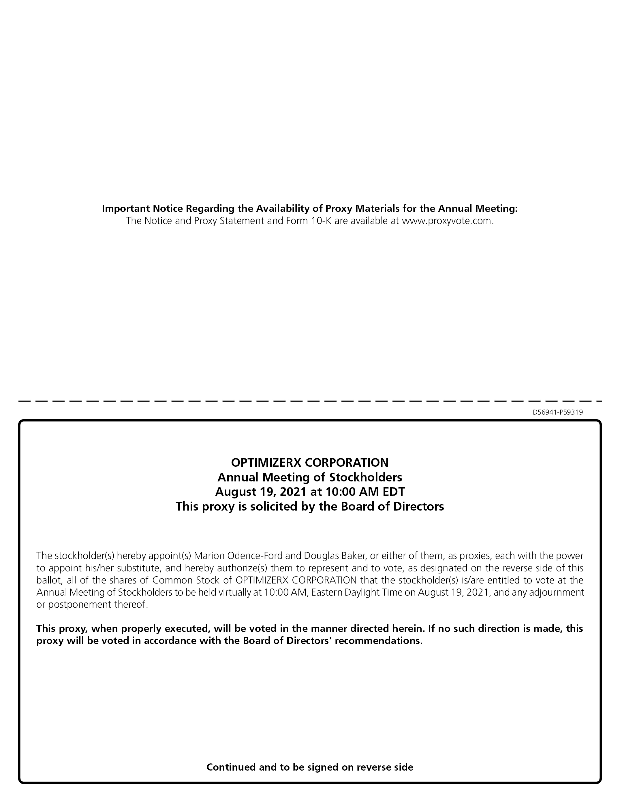 Important Notice Regarding the Availability of Proxy Materials for the Annual Meeting: The Notice and Proxy Statement and Form 10-K are available at www.proxyvote.com. OPTIMIZERX CORPORATION Annual Meeting of Stockholders August 19, 2021 at 10:00 AM EDT This proxy is solicited by the Board of Directors The stockholder(s) hereby appoint(s) Marion Odence-Ford and Douglas Baker, or either of them, as proxies, each with the power to appoint his/her substitute, and hereby authorize(s) them to represent and to vote, as designated on the reverse side of this ballot, all of the shares of Common Stock of OPTIMIZERX CORPORATION that the stockholder(s) is/are entitled to vote at the Annual Meeting of Stockholders to be held virtually at 10:00 AM, Eastern Daylight Time on August 19, 2021, and any adjournment or postponement thereof. This proxy, when properly executed, will be voted in the manner directed herein. If no such direction is made, this proxy will be voted in accordance with the Board of Directors’ recommendations. Continued and to be signed on reverse side