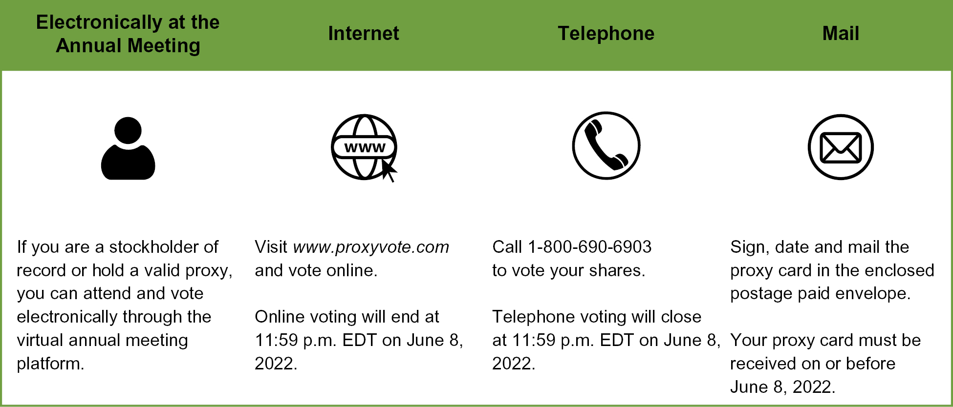 Due to the ongoing public health impact of the COVID-19 pandemic, this year’s annual meeting will be a virtual meeting conducted via live webcast. The annual meeting format will be a live audio webcast where you can view presentation materials made available online. There will be no physical in-person meeting. Additional information regarding attending the annual meeting, voting your shares and submitting questions in advance of the annual meeting can be found in the proxy statement.