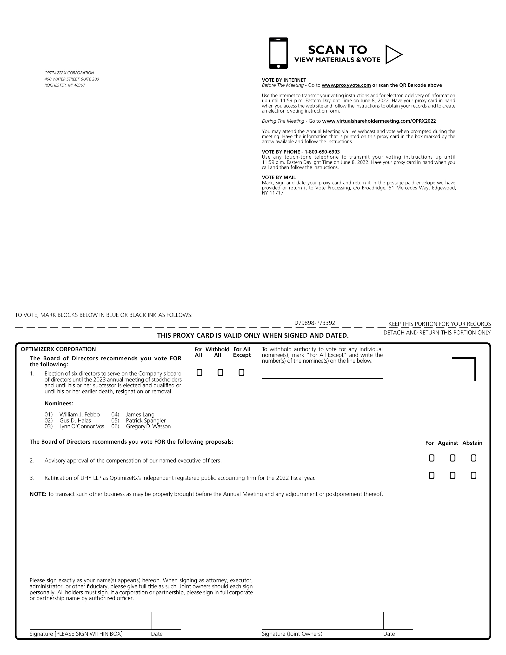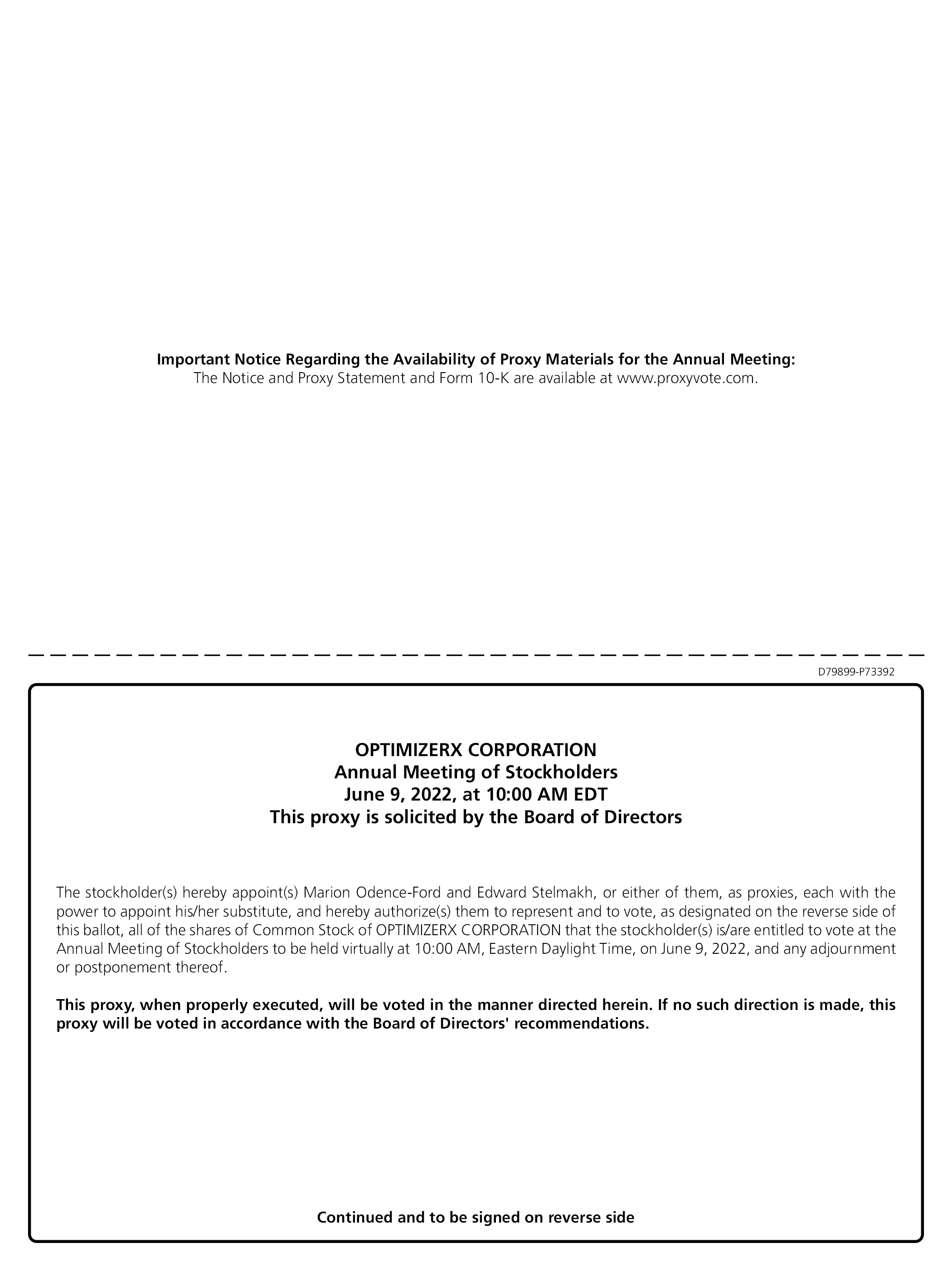 Important Notice Regarding the Availability of Proxy Materials for the Annual Meeting: The Notice and Proxy Statement and Form 10-K are available at www.proxyvote.com. D79899-P73392 OPTIMIZERX CORPORATION Annual Meeting of Stockholders June 9, 2022, at 10:00 AM EDT This proxy is solicited by the Board of Directors The stockholder(s) hereby appoint(s) Marion Odence-Ford and Edward Stelmakh, or either of them, as proxies, each with the power to appoint his/her substitute, and hereby authorize(s) them to represent and to vote, as designated on the reverse side of this ballot, all of the shares of Common Stock of OPTIMIZERX CORPORATION that the stockholder(s) is/are entitled to vote at the Annual Meeting of Stockholders to be held virtually at 10:00 AM, Eastern Daylight Time, on June 9, 2022, and any adjournment or postponement thereof. This proxy, when properly executed, will be voted in the manner directed herein. If no such direction is made, this proxy will be voted in accordance with the Board of Directors’ recommendations. Continued and to be signed on reverse side