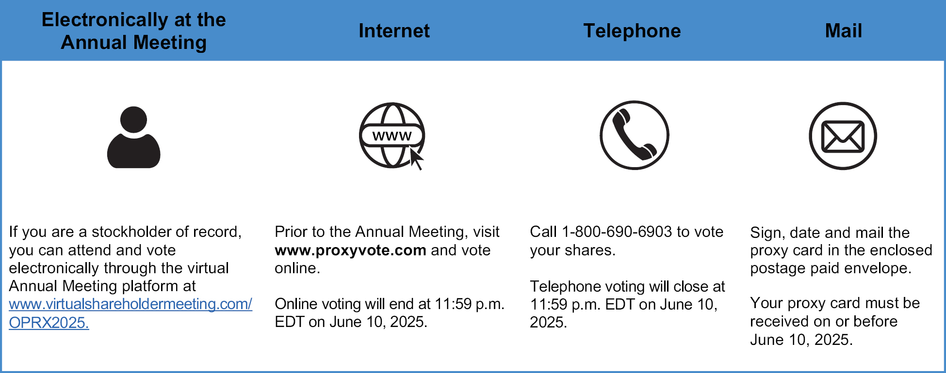 This year’s Annual Meeting of Stockholders will be an entirely virtual meeting. You will be able to attend the Annual Meeting and vote your shares electronically during the meeting by visiting www.virtualshareholdermeeting.com/OPRX2025. The Annual Meeting format will be a live audio webcast where you can view presentation materials made available online. There will be no physical in-person meeting. You may submit questions in advance of the meeting via the internet at www.proxyvote.com. You can submit a question up to 11:59 p.m. EDT on June 10, 2025. Please see “Questions and Answers About the Annual Meeting” for more information regarding the Annual Meeting.