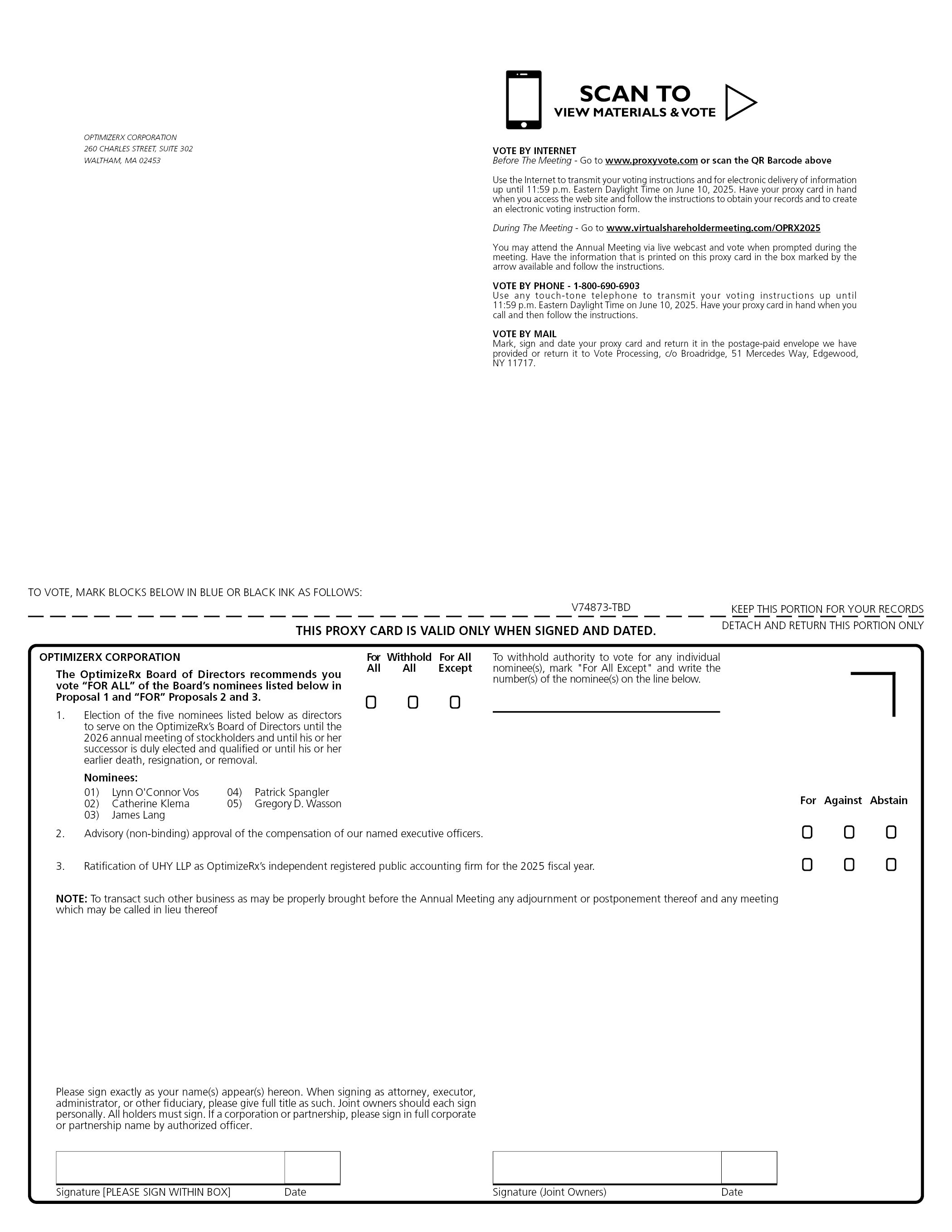 OPTIMIZERX CORPORATION 260 CHARLES STREET, SUITE 302 WALTHAM, MA 02453 SCAN TO VIEW MATERIALS & VOTE Before The Meeting - Go to www.proxyvote.com or scan the QR Barcode above Use the Internet to transmit your voting instructions and for electronic delivery of information up until 11:59 p.m. Eastern Daylight Time on June 10, 2025. Have your proxy card in hand when you access the web site and follow the instructions to obtain your records and to create an electronic voting instruction form. During The Meeting - Go to www.virtualshareholdermeeting.com/OPRX2025 You may attend the Annual Meeting via live webcast and vote when prompted during the meeting. Have the information that is printed on this proxy card in the box marked by the arrow available and follow the instructions. VOTE BY PHONE - 1-800-690-6903 Use any touch-tone telephone to transmit your voting instructions up until 11:59 p.m. Eastern Daylight Time on June 10, 2025. Have your proxy card in hand when you call and then follow the instructions. VOTE BY MAIL Mark, sign and date your proxy card and return it in the postage-paid envelope we have provided or return it to Vote Processing, c/o Broadridge, 51 Mercedes Way, Edgewood, NY 11717. TO VOTE, MARK BLOCKS BELOW IN BLUE OR BLACK INK AS FOLLOWS: V74873-TBD KEEP THIS PORTION FOR YOUR RECORDS THIS PROXY CARD IS VALID ONLY WHEN SIGNED AND DATED. DETACH AND RETURN THIS PORTION ONLY OPTIMIZERX CORPORATION The OptimizeRx Board of Directors recommends you vote “FOR ALL” of the Board’s nominees listed below in Proposal 1 and “FOR” Proposals 2 and 3. 1. Election of the five nominees listed below as directors to serve on the OptimizeRx’s Board of Directors until the 2026 annual meeting of stockholders and until his or her successor is duly elected and qualified or until his or her earlier death, resignation, or removal. Nominees: 01) Lynn O’Connor Vos 02) Catherine Klema 03) James Lang 04) Patrick Spangler 05) Gregory D. Wasson 2. Advisory (non-binding) approval of the compensation of our named executive officers. 3. Ratification of UHY LLP as OptimizeRx’s independent registered public accounting firm for the 2025 fiscal year. For Against Abstain For All Withhold All For All Except To withhold authority to vote for any individual nominee(s), mark “For All Except” and write the number(s) of the nominee(s) on the line below. NOTE: To transact such other business as may be properly brought before the Annual Meeting any adjournment or postponement thereof and any meeting which may be called in lieu thereof Please sign exactly as your name(s) appear(s) hereon. When signing as attorney, executor, administrator, or other fiduciary, please give full title as such. Joint owners should each sign personally. All holders must sign. If a corporation or partnership, please sign in full corporate or partnership name by authorized officer. Signature [PLEASE SIGN WITHIN BOX] Date Signature (Joint Owners) Date