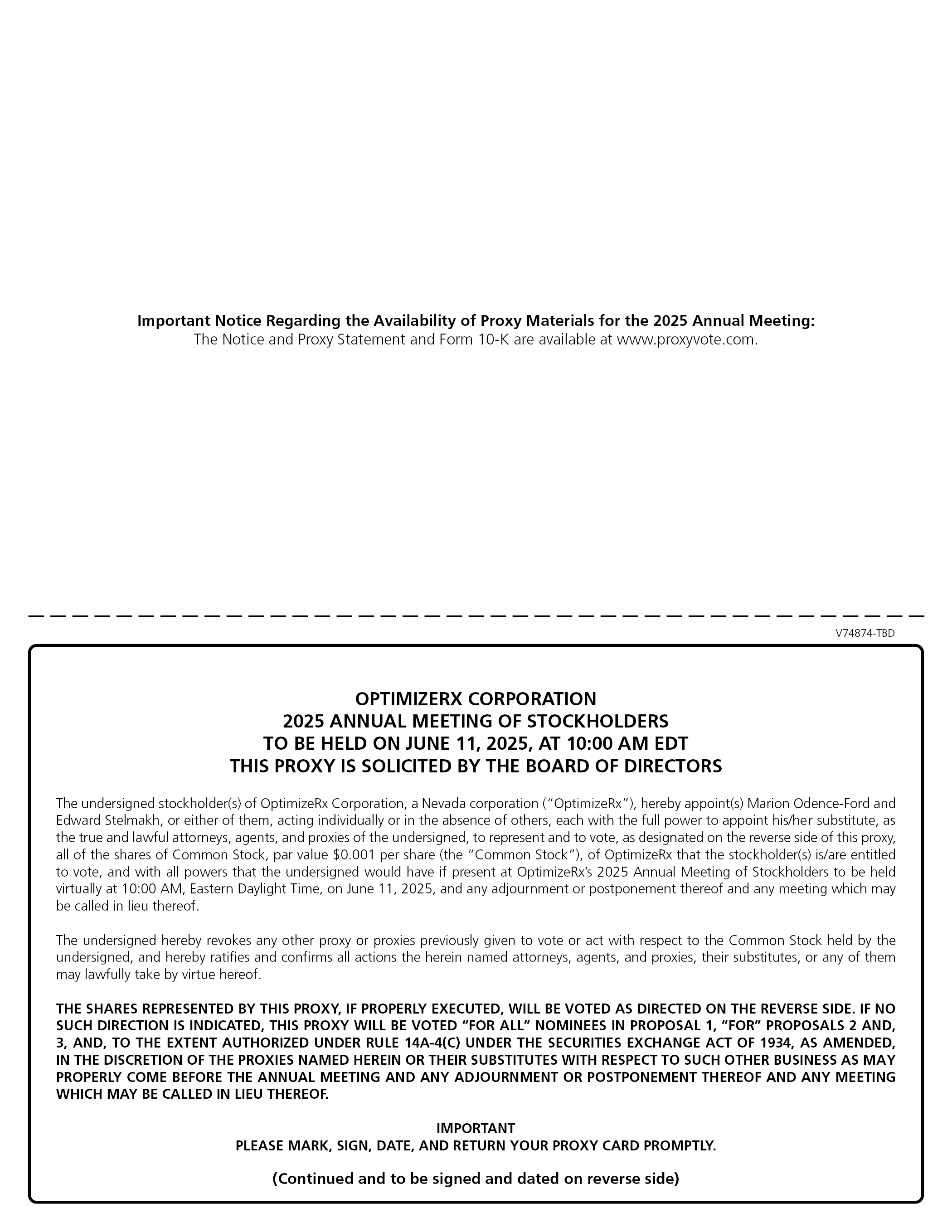 Important Notice Regarding the Availability of Proxy Materials for the 2025 Annual Meeting: The Notice and Proxy Statement and Form 10-K are available at www.proxyvote.com. V74874-TBD OPTIMIZERX CORPORATION 2025 ANNUAL MEETING OF STOCKHOLDERS TO BE HELD ON JUNE 11, 2025, AT 10:00 AM EDT THIS PROXY IS SOLICITED BY THE BOARD OF DIRECTORS The undersigned stockholder(s) of OptimizeRx Corporation, a Nevada corporation (“OptimizeRx”), hereby appoint(s) Marion Odence-Ford and Edward Stelmakh, or either of them, acting individually or in the absence of others, each with the full power to appoint his/her substitute, as the true and lawful attorneys, agents, and proxies of the undersigned, to represent and to vote, as designated on the reverse side of this proxy, all of the shares of Common Stock, par value $0.001 per share (the “Common Stock”), of OptimizeRx that the stockholder(s) is/are entitled to vote, and with all powers that the undersigned would have if present at OptimizeRx’s 2025 Annual Meeting of Stockholders to be held virtually at 10:00 AM, Eastern Daylight Time, on June 11, 2025, and any adjournment or postponement thereof and any meeting which may be called in lieu thereof. The undersigned hereby revokes any other proxy or proxies previously given to vote or act with respect to the Common Stock held by the undersigned, and hereby ratifies and confirms all actions the herein named attorneys, agents, and proxies, their substitutes, or any of them may lawfully take by virtue hereof. THE SHARES REPRESENTED BY THIS PROXY, IF PROPERLY EXECUTED, WILL BE VOTED AS DIRECTED ON THE REVERSE SIDE. IF NO SUCH DIRECTION IS INDICATED, THIS PROXY WILL BE VOTED “FOR ALL” NOMINEES IN PROPOSAL 1, “FOR” PROPOSALS 2 AND, 3, AND, TO THE EXTENT AUTHORIZED UNDER RULE 14A-4(C) UNDER THE SECURITIES EXCHANGE ACT OF 1934, AS AMENDED, IN THE DISCRETION OF THE PROXIES NAMED HEREIN OR THEIR SUBSTITUTES WITH RESPECT TO SUCH OTHER BUSINESS AS MAY PROPERLY COME BEFORE THE ANNUAL MEETING AND ANY ADJOURNMENT OR POSTPONEMENT THEREOF AND ANY MEETING WHICH MAY BE CALLED IN LIEU THEREOF. IMPORTANT PLEASE MARK, SIGN, DATE, AND RETURN YOUR PROXY CARD PROMPTLY. (Continued and to be signed and dated on reverse side)