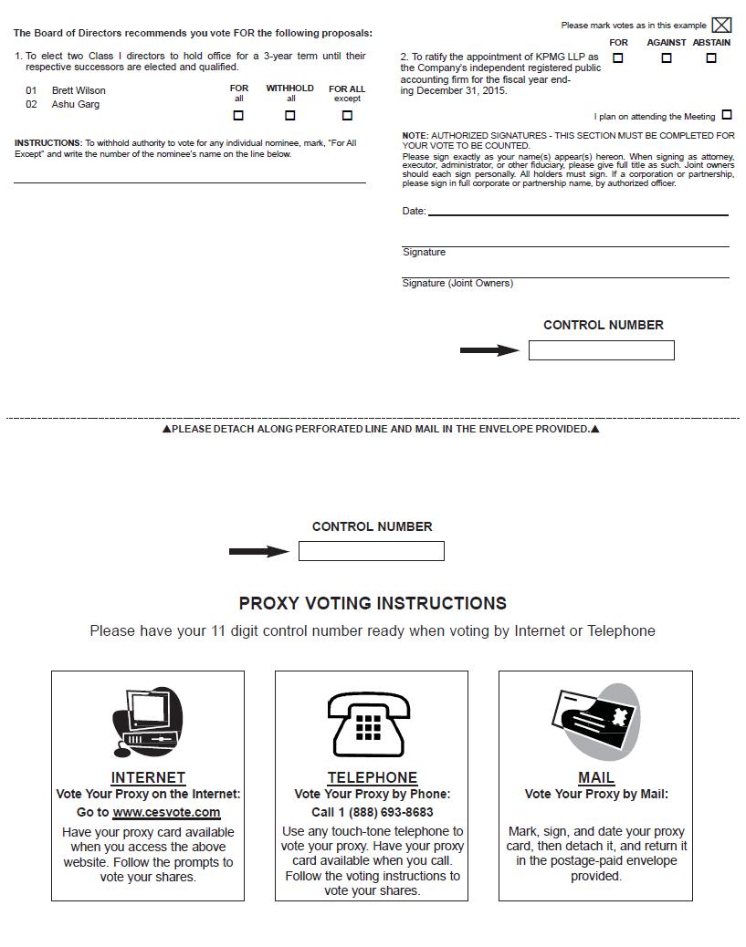 The Board of Directors recommends you vote FOR the following proposals: Please mark votes as in this example ⌧ FOR AGAINST ABSTAIN 1. To elect two Class I directors to hold office for a 3-year term until their respective successors are elected and qualified. 2. To ratify the appointment of KPMG LLP as the Company’s independent registered public accounting firm for the fiscal year end- 01 Brett Wilson 02 Ashu Garg FOR all WITHHOLD all FOR ALL except ing December 31, 2015. I plan on attending the Meeting INSTRUCTIONS: To withhold authority to vote for any individual nominee, mark, “For All Except” and write the number of the nominee’s name on the line below. NOTE: AUTHORIZED SIGNATURES - THIS SECTION MUST BE COMPLETED FOR YOUR VOTE TO BE COUNTED. Please sign exactly as your name(s) appear(s) hereon. When signing as attorney, executor, administrator, or other fiduciary, please give full title as such. Joint owners should each sign personally. All holders must sign. If a corporation or partnership, please sign in full corporate or partnership name, by authorized officer. Date: Signature Signature (Joint Owners) CONTROL NUMBER PLEASE DETACH ALONG PERFORATED LINE AND MAIL IN THE ENVELOPE PROVIDED. CONTROL NUMBER PROXY VOTING INSTRUCTIONS Please have your 11 digit control number ready when voting by Internet or Telephone INTERNET Vote Your Proxy on the Internet: Go to www.cesvote.com Have your proxy card available when you access the above website. Follow the prompts to vote your shares. TELEPHONE Vote Your Proxy by Phone: Call 1 (888) 693-8683 Use any touch-tone telephone to vote your proxy. Have your proxy card available when you call. Follow the voting instructions to vote your shares. MAIL Vote Your Proxy by Mail: Mark, sign, and date your proxy card, then detach it, and return it in the postage-paid envelope provided.