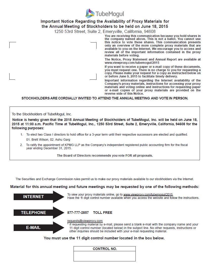 Important Notice Regarding the Availability of Proxy Materials for the Annual Meeting of Stockholders to be held on June 18, 2015 1250 53rd Street, Suite 2, Emeryville, California, 94608 You are receiving this communication because you hold shares in the company named above. This is not a ballot. You cannot use this notice to vote these shares. This communication presents only an overview of the more complete proxy materials that are available to you on the Internet. We encourage you to access and review all of the important information contained in the proxy materials before voting. The Notice, Proxy Statement and Annual Report are available at www.viewproxy.com/tubemogul/2015 If you want to receive a paper or e-mail copy of these documents, you must request one. There is no charge to you for requesting a copy. Please make your request for a copy as instructed below on or before June 9, 2015 to facilitate timely delivery. Important information regarding the Internet availability of the Company’s proxy materials, instructions for accessing your proxy materials and voting online and instructions for requesting paper or e-mail copies of your proxy materials are provided on the reverse side of this Notice. STOCKHOLDERS ARE CORDIALLY INVITED TO ATTEND THE ANNUAL MEETING AND VOTE IN PERSON. To the Stockholders of TubeMogul, Inc. Notice is hereby given that the 2015 Annual Meeting of Stockholders of TubeMogul, Inc. will be held on June 18, 2015 at 11:00 a.m. Pacific Time at TubeMogul, Inc., 1250 53rd Street, Suite 2, Emeryville, California, 94608 for the following purposes: 1. To elect two Class I directors to hold office for a 3-year term until their respective successors are elected and qualified. 01. Brett Wilson, 02. Ashu Garg 2. To ratify the appointment of KPMG LLP as the Company’s independent registered public accounting firm for the fiscal year ending December 31, 2015. The Board of Directors recommends you vote FOR all proposals. The Securities and Exchange Commission rules permit us to make our proxy materials available to our stockholders via the Internet. Material for this annual meeting and future meetings may be requested by one of the following methods: INTERNET TELEPHONE To view your proxy materials online, go to www.viewproxy.com/tubemogul/2015. Have the 11 digit control number available when you access the website and follow the instructions. 877-777-2857 TOLL FREE E-MAIL requests@viewproxy.com * If requesting material by e-mail, please send a blank e-mail with the company name and your 11 digit control number (located below) in the subject line. No other requests, instructions or other inquiries should be included with your e-mail requesting material. You must use the 11 digit control number located in the box below. CONTROL NO.