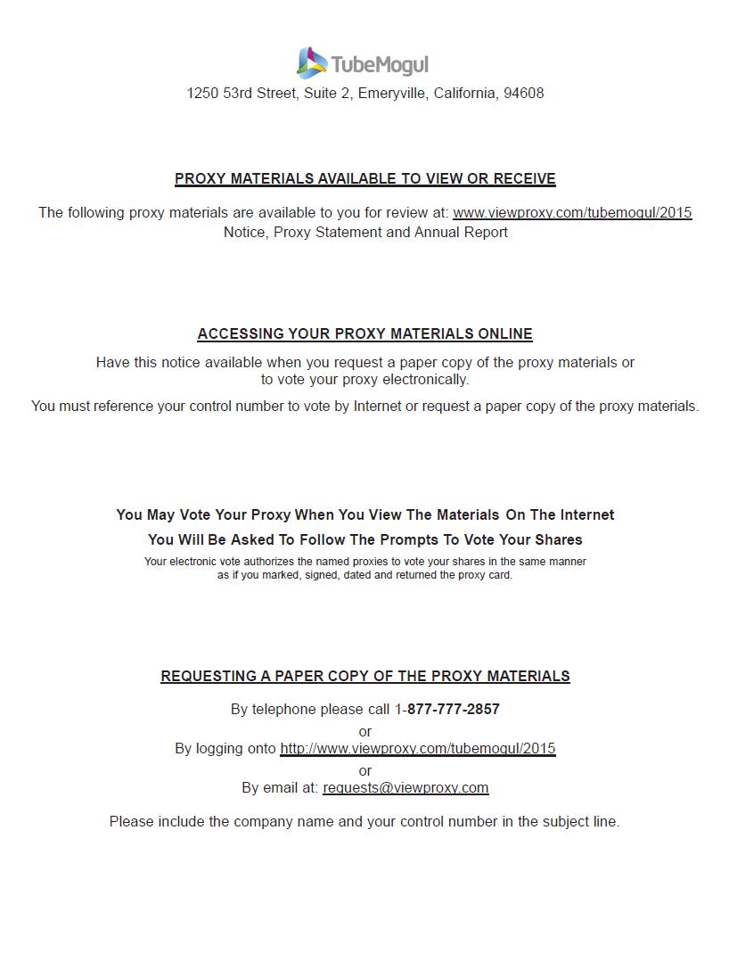 1250 53rd Street, Suite 2, Emeryville, California, 94608 PROXY MATERIALS AVAILABLE TO VIEW OR RECEIVE The following proxy materials are available to you for review at: www.viewproxy.com/tubemogul/2015 Notice, Proxy Statement and Annual Report ACCESSING YOUR PROXY MATERIALS ONLINE Have this notice available when you request a paper copy of the proxy materials or to vote your proxy electronically. You must reference your control number to vote by Internet or request a paper copy of the proxy materials. You May Vote Your Proxy When You View The Materials On The Internet You Will Be Asked To Follow The Prompts To Vote Your Shares Your electronic vote authorizes the named proxies to vote your shares in the same manner as if you marked, signed, dated and returned the proxy card. REQUESTING A PAPER COPY OF THE PROXY MATERIALS By telephone please call 1-877-777-2857 or By logging onto http://www.viewproxy.com/tubemogul/2015 or By email at: requests@viewproxy.com Please include the company name and your control number in the subject line.