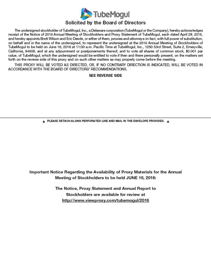 Solicited by the Board of Directors The undersigned stockholder of TubeMogul, Inc., a Delaware corporation (TubeMogul or the Company), hereby acknowledges receipt of the Notice of 2016 Annual Meeting of Stockholders and Proxy Statement of TubeMogul, each dated April 29, 2016, and hereby appoints Brett Wilson and Eric Deeds, or either of them, proxies and attorneys-in-fact, with full power of substitution, on behalf and in the name of the undersigned, to represent the undersigned at the 2016 Annual Meeting of Stockholders of TubeMogul to be held on June 16, 2016 at 11:00 a.m. Pacific Time at TubeMogul, Inc., 1250 53rd Street, Suite 2, Emeryville, California, 94608, and at any adjournment or postponements thereof, and to vote all shares of common stock, $0.001 par value, of TubeMogul, which the undersigned would be entitled to vote if then and there personally present, on the matters set forth on the reverse side of this proxy and on such other matters as may properly come before the meeting. THIS PROXY WILL BE VOTED AS DIRECTED, OR, IF NO CONTRARY DIRECTION IS INDICATED, WILL BE VOTED IN ACCORDANCE WITH THE BOARD OF DIRECTORS’ RECOMMENDATIONS. SEE REVERSE SIDE t t PLEASE DETACH ALONG PERFORATED LINE AND MAIL IN THE ENVELOPE PROVIDED. Important Notice Regarding the Availability of Proxy Materials for the Annual Meeting of Stockholders to be held JUNE 16, 2016: The Notice, Proxy Statement and Annual Report to Stockholders are available for review at http://www.viewproxy.com/tubemogul/2016