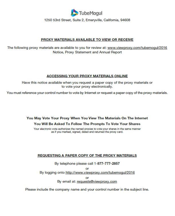 Important Notice Regarding the Availability of Proxy Materials for the Annual Meeting of Stockholders to be held on June 16, 2016 1250 53rd Street, Suite 2, Emeryville, California, 94608 You are receiving this communication because you hold shares in the company named above. This is not a ballot. You cannot use this notice to vote these shares. This communication presents only an overview of the more complete proxy materials that are available to you on the Internet. We encourage you to access and review all of the important information contained in the proxy materials before voting. The Notice, Proxy Statement and Annual Report are available at www.viewproxy.com/tubemogul/2016 If you want to receive a paper or e-mail copy of these documents, you must request one. There is no charge to you for requesting a copy. Please make your request for a copy as instructed below on or before June 7, 2016 to facilitate timely delivery. Important information regarding the Internet availability of the Company’s proxy materials, instructions for accessing your proxy materials and voting online and instructions for requesting paper or e-mail copies of your proxy materials are provided on the reverse side of this Notice. STOCKHOLDERS ARE CORDIALLY INVITED TO ATTEND THE ANNUAL MEETING AND VOTE IN PERSON. To the Stockholders of TubeMogul, Inc. Notice is hereby given that the 2016 Annual Meeting of Stockholders of TubeMogul, Inc. will be held on June 16, 2016 at 11:00 a.m. Pacific Time at TubeMogul, Inc., 1250 53rd Street, Suite 2, Emeryville, California, 94608 for the following purposes: 1. To elect a Class II director to hold office for a 3-year term until his respective successor is elected and qualified. 01. David Toth 2. To ratify the appointment of KPMG LLP as the Company’s independent registered public accounting firm for the fiscal year ending December 31, 2016. The Board of Directors recommends you vote FOR all proposals. The Securities and Exchange Commission rules permit us to make our proxy materials available to our stockholders via the Internet. Material for this annual meeting and future meetings may be requested by one of the following methods: To view your proxy materials online, go to www.viewproxy.com/tubemogul/2016. Have the 11 digit control number available when you access the website and follow the instructions. INTERNET TELEPHONE E-MAIL 877-777-2857 TOLL FREE requests@viewproxy.com * If requesting material by e-mail, please send a blank e-mail with the company name and your 11 digit control number (located below) in the subject line. No other requests, instructions or other inquiries should be included with your e-mail requesting material. You must use the 11 digit control number located in the box below. CONTROL NO.