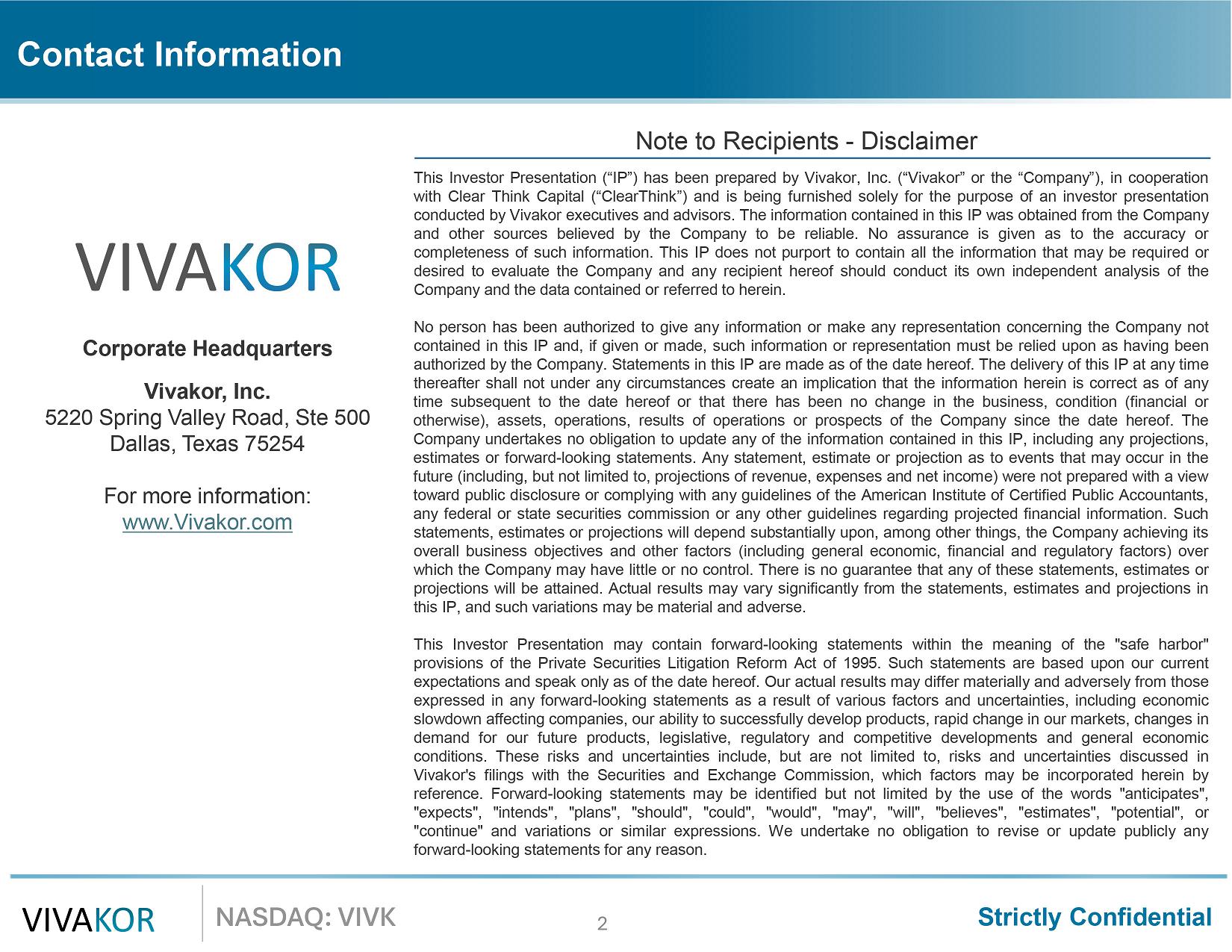 C ontac t Info rm ation Not e to Re ci p i ent s - D iscl a i mer Co r po r a te H ea dqu a r t e r s V i v ak o r , I n c . 522 0 Sp ri n g V a ll e y R oad , S t e 50 0 D a ll a s , T e x a s 7525 4 F o r m o re i n f o r m a t i o n : ww w . V i v a k o r .c o m T hi s In ve s to r P r e s en t at io n (“ IP ”) ha s be e n p r e p a r e d b y Vi va k o r, I n c . (“ Viva k o r ” o r the “C o m pan y ” ), i n c oop e r at ion w i th C lea r T hin k C api ta l ( “ C lea r T hin k ”) an d i s bein g f u r ni s he d s ole l y f o r the pu r po s e o f a n inve s to r p r e s entat ion c ondu c t e d by V iva k o r e x ec ut ive s an d advi s o r s . T h e i n fo r m a t io n c onta ine d i n th i s IP w a s obta ine d f r o m the C o m p a n y an d othe r s our c e s belie v e d by the C o m pan y to b e r elia b le . No a ss u r an c e i s g i ve n a s to the a cc u r a c y or c o m pl etene s s o f s u c h in f or m at ion . T hi s IP doe s no t p u r po rt to c onta i n al l the i nfo r m a t io n tha t ma y b e r equ i r e d or de s i r e d to eval uate the C o m pa n y an d a n y r e c ipien t he r eo f s houl d c ond u c t i t s o w n independen t ana l y s i s o f t he C o m pan y an d the data c onta ine d o r r e f e rr e d to he r ein . No pe r s o n ha s bee n auth o r i z e d to giv e a n y in f or m at io n o r m a k e an y r ep r e s entat io n c once r nin g the C o m p a n y not c onta ine d i n th i s IP a nd , i f give n o r m a d e , s u c h i n f or m at io n o r r ep r es entat io n m u s t b e r elie d upo n a s havin g been autho r i z e d by the C o m pa n y . Stat e m en t s i n th i s IP a re m a d e a s o f t h e da t e he r e o f . T h e delive r y o f th i s IP a t a n y t i m e the r e a f te r s hal l no t unde r a n y c i r c u m s tan ce s c r eate a n i m pli c at io n tha t the in f or m at io n he r ei n i s c o rr e c t a s o f a n y t i m e s u b s eq u en t to the d ate he r e o f o r tha t the re h a s bee n n o c han g e i n the bu s ine ss , c ondi t io n ( f inan c ia l or otherw i s e ), a ss et s , ope r at i on s , r esul t s o f o p e r at ion s o r p r o s p e c t s o f t h e C o m pa n y s in c e the date h e r e o f . T he C o m pan y unde r ta k e s n o o bliga t io n to update an y o f the in f or m at io n c onta ine d i n th i s IP , in c lu d in g a n y p r o j e c t ion s , e s t i m at e s o r f o r w a r d - loo k in g s tat e m e n t s . A n y s tate m e nt , e s t i m a te o r p r o j e c t io n a s to ev ent s tha t m a y o cc u r i n the f u t u re ( in c luding , bu t no t li m i ted to , p r o j e c t ion s o f r eve n ue , e x p e n s e s an d ne t in c o m e ) w e re no t p r e p a r e d w i th a vi e w to w a rd pu b li c d i sc lo s u re o r c o m p l y in g w i th a n y g u ide l i n e s o f the A m e r i c a n In s t i tute o f C e r t i f ie d Publi c A cc oun t ant s , a n y f ede r a l o r s tate s e c u r i t ie s c o m m i ss io n o r an y ot h e r guideline s r ega r din g p r o j e c ted f ina n c ia l in f o r m at ion . Su ch s tat e m en t s , e s t i m ate s o r pro j e c t ion s w i l l depen d s u b s t ant ia ll y upon , a m on g othe r th ing s , the C o m pa n y a c hievin g i t s ove r a l l bu s ine s s ob j e c t ive s an d othe r f a c to rs ( in c lud i n g gene r a l e c on o m i c , f in a n c ia l an d r egul ato r y f a c to r s ) ov er w h i c h the C o m pa n y m ay h av e l i t t l e o r n o c ont r ol . T h e re i s n o gua r antee tha t an y o f th e s e s ta te m ent s , e s t i m ate s or p r o j e c t ion s w i l l b e atta ined . A c tua l r e s ul t s m ay va r y si gni f i c ant l y f r o m the s tat e ment s , e s t i m a t e s a n d p r o j e c t ion s in th i s IP , an d s u c h va r i at ion s m a y b e m ate r ia l an d adve r s e . T hi s In ve s to r P r e s en t at io n m a y c onta i n f o r w a r d - lo o k in g s t a t e m en t s w i th i n t h e m eanin g o f the " s a fe ha r bo r" p r ovi s ion s o f the P r iv ate S e c u r i t ie s Li t i gat io n R e f or m A c t o f 19 9 5 . Su c h s ta te m e nt s a re ba s e d up o n ou r cu rr ent e x pe c t a t ion s an d s p e a k on l y a s o f the date he r eo f . O u r a c tua l r e s ul t s m ay d i f f e r m ate r ia ll y an d adve r sel y f r o m tho s e e x p r e s se d i n a n y f o r w a r d - l o o k in g s tat e m ent s a s a r e s ul t o f va r iou s fa c to rs an d un c e r ta i nt ie s , in c ludin g e c on o m i c s l o w d o w n af f e c t in g c o m pa n ie s , ou r abi l i t y to s u cc e s s f u l l y d e velo p p r odu c t s , r api d chang e i n ou r m ar k e t s , cha n ge s in d e m an d f o r o u r f utu re produ c t s , legi s l at i ve , r egul ato r y an d c o m pet i t iv e deve l o p m ent s an d ge n e r a l e c o n o m i c c ondi t ion s . T h e s e r is k s a n d un c e r ta i nt ie s in c lude , bu t a re no t li m i ted to , r i sk s an d u n c e r ta i nt ie s di sc u ss e d in V i va k o r ' s f iling s w i th the Se c u r i t ie s an d E xc h a ng e C o m m i ss ion , w hi c h f a c to r s m ay b e in c o r po r ated h e r ei n by r e f e r e n c e . F o r w a r d - loo k in g s tat e m en t s m ay b e i dent i f ie d bu t no t li m i ted by the u s e o f the w o r d s " ant i c i p ate s " , "e x pe c t s " , "i nten d s " , "plan s " , " s hould" , " c ould" , " w o uld" , " m a y " , " w il l" , "be l i ev e s " , "e s t i m ate s " , " pot e nt ial" , or " c ont inue " an d va r ia t ion s o r s i m ila r e x p r e ss ion s . W e unde r t a k e n o obli gat io n to r e v i s e o r update publ icl y a n y f o r w a r d - loo k in g s tate m ent s f o r an y r ea s on . 2 St ric t ly Conf i d e nt ial N A S D A Q : V I VK VI V A V I VA