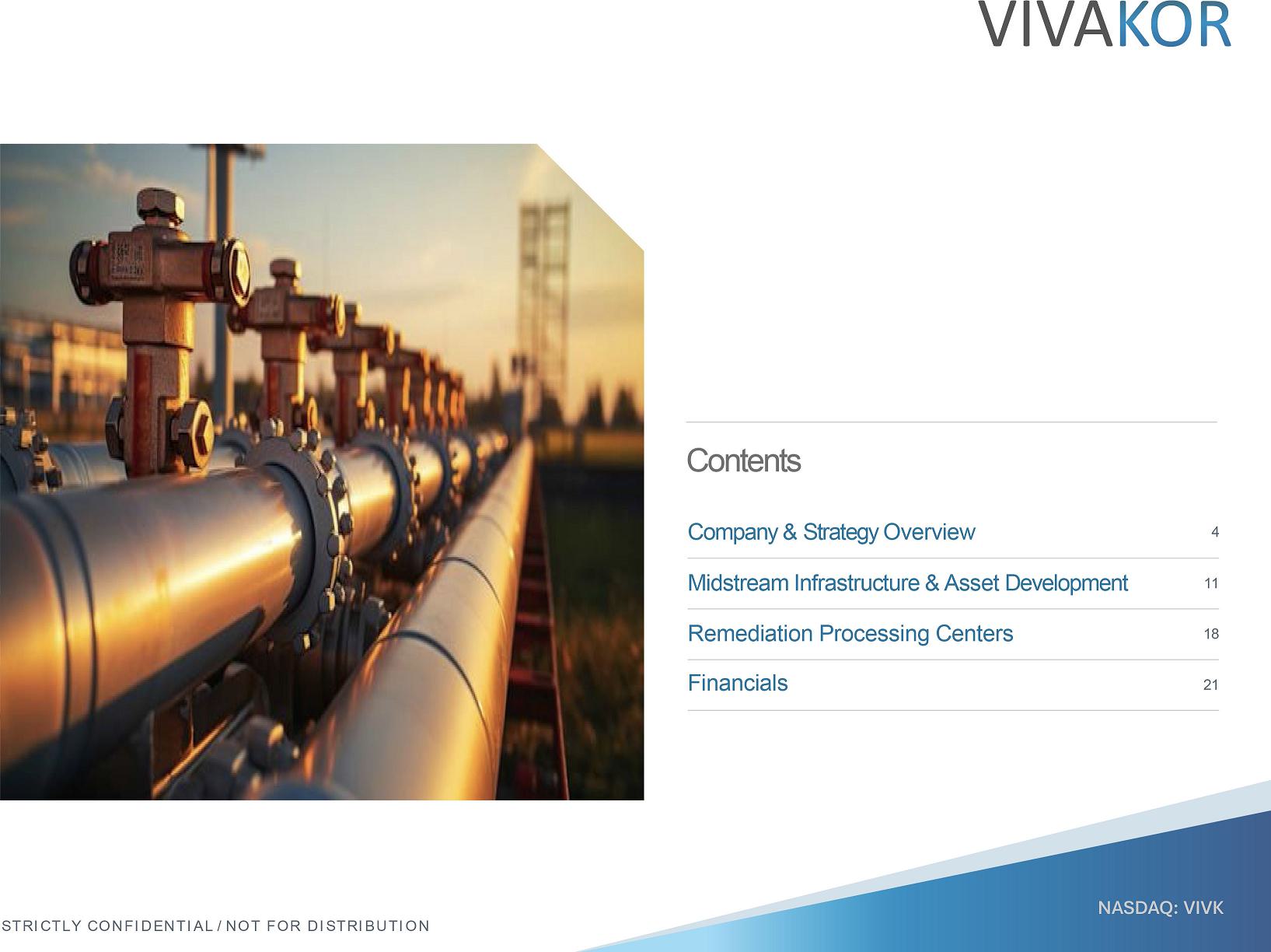 Con t en t s N A S D A Q : V I V K S T R I C T L Y C O N F I D E N T I A L / N O T FO R D I S T R I B U T I O N VI V A 4 C o m pa n y & S t ra t eg y O v er v iew 11 M id st rea m I n f ra s t ru ct ur e & A ss e t D e v elop m ent 18 R e m edia t io n Pro c e ss in g C en t er s 21 F inan c ial s
