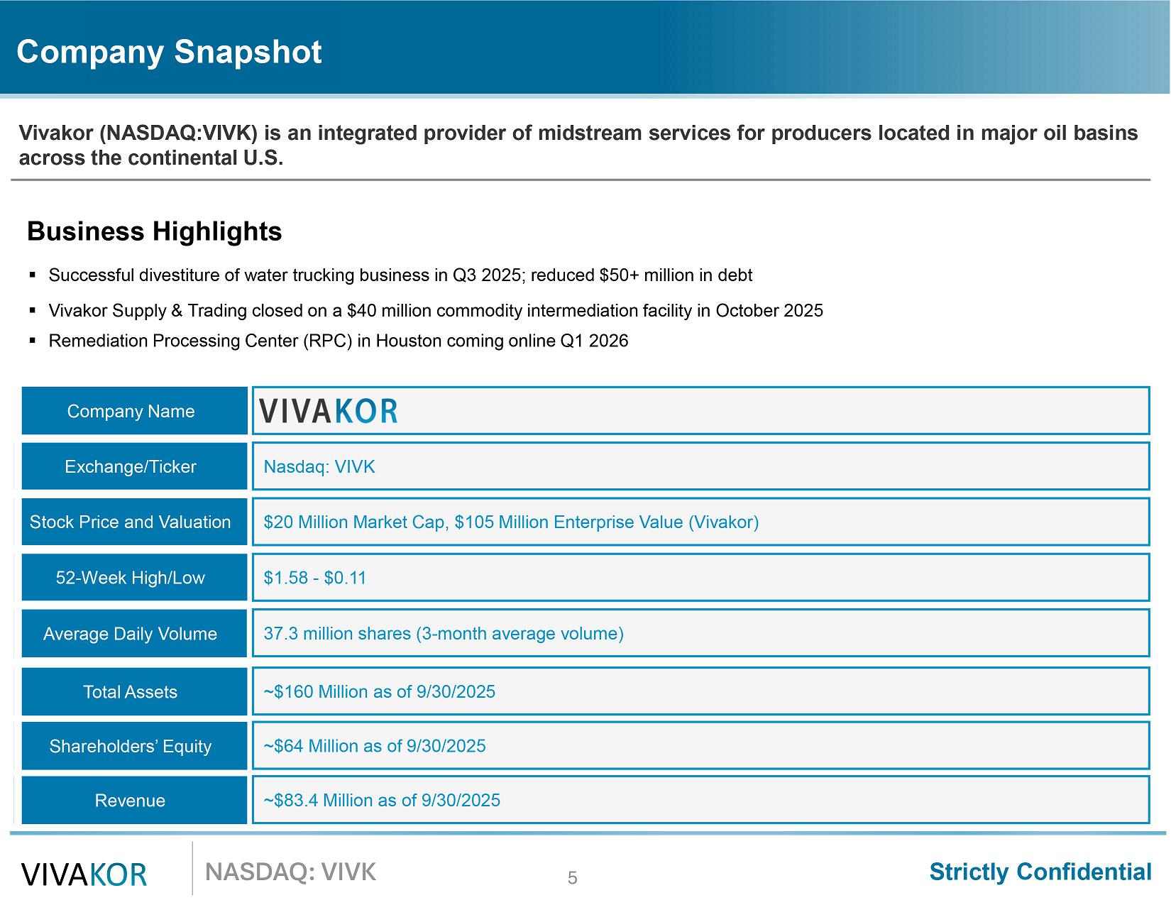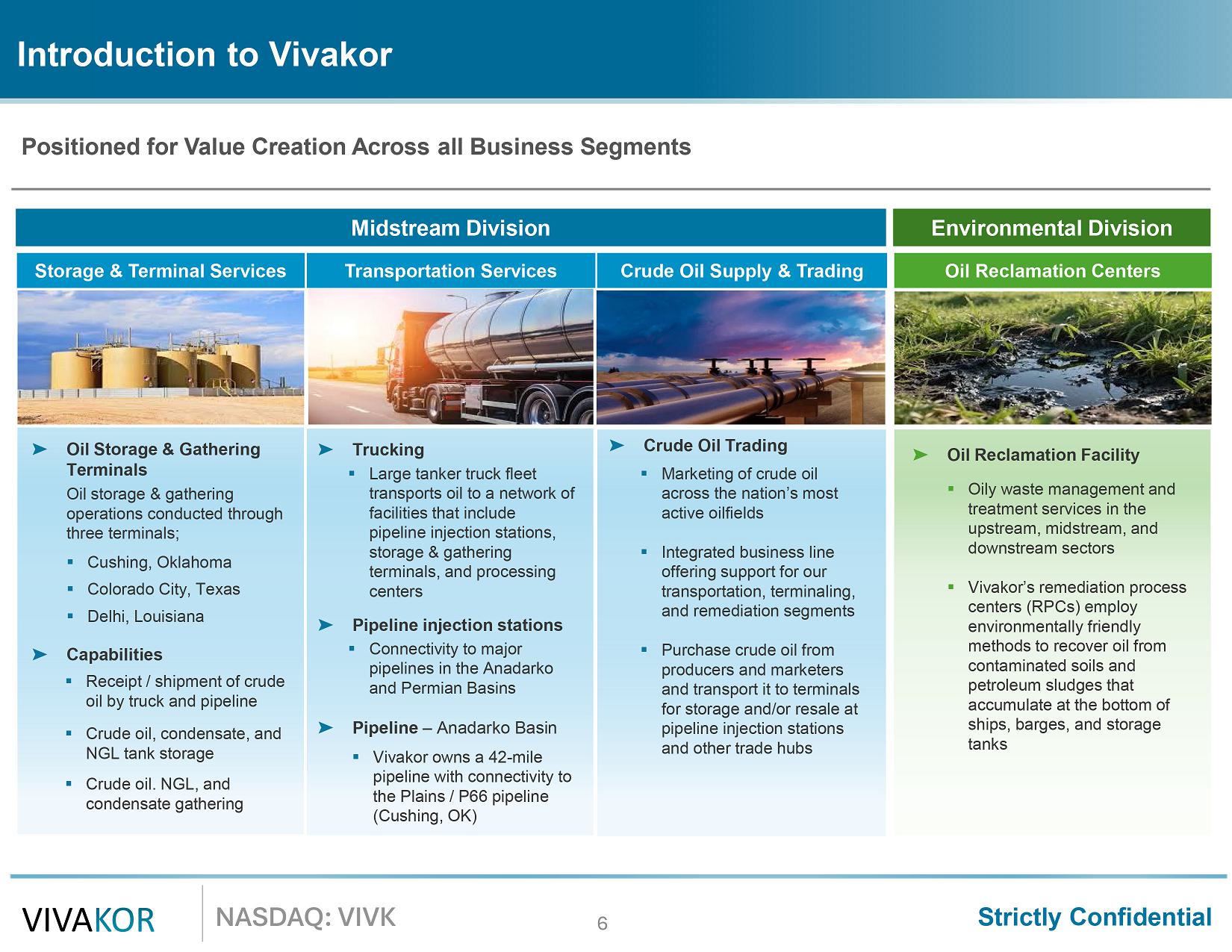 V i v ak o r ( N A S D A Q : V I V K ) i s a n i n t e gr a t e d p r o v id e r o f m i d s t r e a m s e r v i c e s f o r produ c e r s lo c a t e d i n m a j o r o i l b a s i n s ac r o s s t h e c on t i n e n t a l U . S. B u s ines s H ighligh ts ▪ S ucce ss f u l d i v es tit u r e of w at er tr uck i ng bus i ness i n Q 3 202 5 ; r educed $50 + m illi on i n debt ▪ V i v akor S upp l y & T r ad i ng c l osed on a $40 m illi on co mm od it y int e r m e d i a ti on f ac ili ty i n O c t ober 2025 ▪ R e m ed i a ti o n P r ocess i ng C enter (R P C ) i n H ous t on co m i ng on li ne Q 1 2026 C o m pa n y N a m e C o m pan y S napshot 5 St ric t ly Conf i d e nt ial N A S D A Q : V I VK VI V A E x chan g e/ T i cker N asda q : VIVK Stock P ri ce and V a l uat i o n $20 Milli on M a r k et C ap, $105 Milli on Ent e r p ri se V a l ue ( V i v ako r ) 52 - W ee k Hi g h / Low $ 1.58 - $0. 1 1 A v e r a g e D a il y V o l u m e 37.3 m illi on sha r es ( 3 - m onth a v e r a g e v o l u m e) T ot al A ss et s ~ $160 Milli on as of 9/ 30/20 2 5 Sha r eh o l de r s’ Eq u it y ~ $64 Milli on as of 9/ 30/20 2 5 R e v enue ~ $83.4 Milli on as of 9/ 30/2 02 5