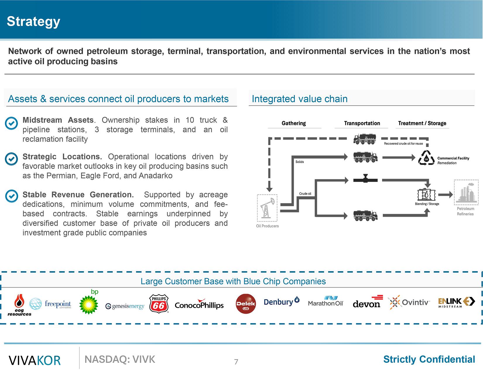 Po si t i on e d f o r V a l u e C r ea ti o n A c r o s s a ll B u si n es s S e gm e n t s M i d s t r e a m D i v i s i o n S t o r a g e & T erm i n al S er v i ces T r a n s po r t a ti o n S er v i ces C r ud e Oil S upp l y & T ra d i ng E n v ir on me n t a l D i v i s i on Oil R eclama ti o n C e n t ers ڻ Oi l S t o r ag e & G a t he r i ng T e rm i na l s O i l s t o r age & ga t he r i ng ope r a t i ons conduc t ed t h r ough t h r ee t e r mi na l s; ڻ C apab ili t i es ڻ T r uck i ng ڻ P i pe li n e i n j ec t i o n s t a t i ons ڻ P i pe li n e – Anada r k o Ba s i n ڻ C r ud e Oi l T r ad i ng ڻ Oi l R ec l a m a t i o n Fac i li t y ▪ C onnec t i v i t y t o m a j or p i pe li nes i n t he Anada r k o and Pe r mi an Bas i ns ▪ R ece i pt / sh i p m ent of c r ude o i l by t r uck and p i pe li ne ▪ C r ude o il , condensa t e, and N G L t ank s t o r age ▪ C r ude o il . N G L, and condensa t e ga t he r i ng ▪ M a r k e t i ng of c r ude o i l ac r oss t he na t i on ’ s m ost ac t i v e o ilfi e l ds ▪ I n t eg r a t ed bus i ness li ne o ff e r i ng suppo r t f or our t r anspo r t a t i on, t e r mi na li ng, and r e m ed i a t i on seg m en t s ▪ Pu r chase c r ude o i l f r om p r oduce r s and m a r k e t e r s and t r anspo r t i t t o t e r mi na l s f or s t o r age and / or r esa l e at p i pe li ne i n j ec t i on s t a t i ons and o t her t r ade hubs ▪ O il y w as t e m anage m ent and t r ea t m ent se r v i ces i n t he ups t r ea m , mi d s t r ea m , and do w ns t r eam sec t o r s ▪ V i v a k o r ’ s r e m ed i a t i on p r ocess cen t e r s ( R P C s) e m p l oy en v i r on m en t a ll y f r i end l y m e t hods t o r e c o v er o i l f r om con t a mi na t ed so il s and pe t r o l eum s l udges t hat accu m u l a t e at t he bo tt om of sh i ps, ba r ges, and s t o r age t an k s ▪ La r ge t an k er t r uck fl eet t r anspo r t s o i l t o a ne tw o r k of f ac ili t i es t hat i n c l ude p i pe li ne i n j ec t i on s t a t i ons, s t o r age & ga t he r i ng t e r mi na l s, and p r ocess i ng cen t e r s ▪ V i v a k or o w ns a 42 - mile p i pe li ne w i t h connec t i v i t y t o t he P l a i ns / P66 p i pe li ne ( C ush i ng, O K) ▪ C ush i ng, O k l aho m a ▪ C o l o r ado Ci t y , Texas ▪ D e l h i , Lou i s i ana Int r oductio n t o V ivakor 6 St ric t ly Conf i d e nt ial N A S D A Q : V I VK VI V A