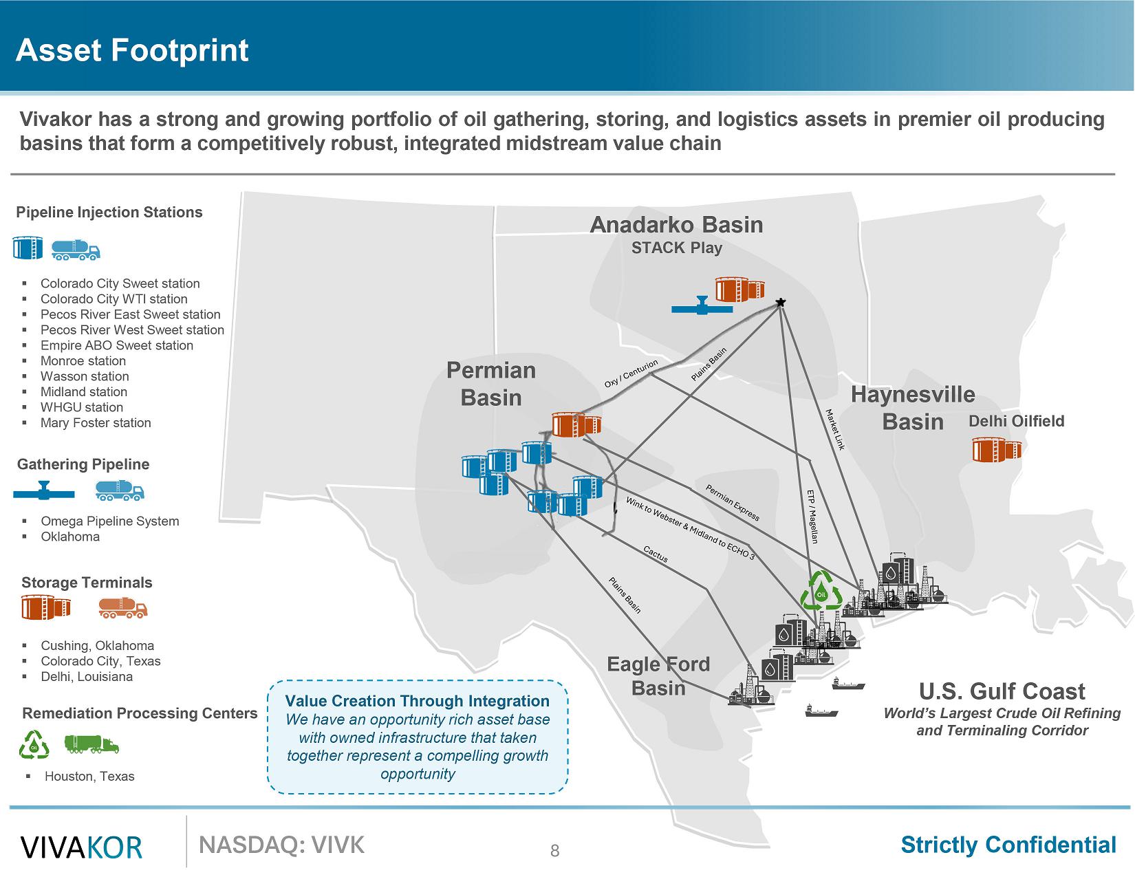 N e t w or k o f o w n e d p e t r o l e u m s t o r a g e , t e r m i n a l , t r a n s po r t a t i o n , a n d e n v ir on me n t a l se r v i c e s i n t h e n a t i o n ’ s m o st ac t i v e o i l p r odu c i n g b as i ns A ss et s & s er vic e s c onne ct o i l produ c er s to mar k et s Integ rate d v a l u e c ha i n M id s tr e am A s s e t s . O w n e rs h i p s t a k e s in 1 0 tr u ck & p i pe l i n e st a t i on s , 3 s t o r a g e t e rm i na l s, a n d a n o il reclamati o n f a cility Str a t e g i c L o c a ti on s . O p e r a t i ona l l o ca ti on s d r i v e n by f a v o r ab l e m a rk e t o u t l oo ks i n ke y o il p r o du ci n g ba s i n s s u ch a s t h e P e rmia n , Eag le F o r d , an d Anada rko Sta b le Re v en ue G e n e r a t io n . S u pp or t e d b y a c r e age x x x ded i c a ti o n s, mi n i m u m vol u me c o m mi t me n ts, a n d f ee - by a n d ba s e d c on t r a c ts . Stable e a r n i ng s d i v e r sifi e d c u s t o m e r b a se o f p r i v a te i n v e stm en t g r ad e pub lic c ompan i e s u nd e r p i n n e d o il p ro d uc e rs S t r ategy 7 St ric t ly Conf i d e nt ial N A S D A Q : V I VK VI V A La r g e C u st o m e r Ba s e w i t h B l u e C h ip C o m pan i e s