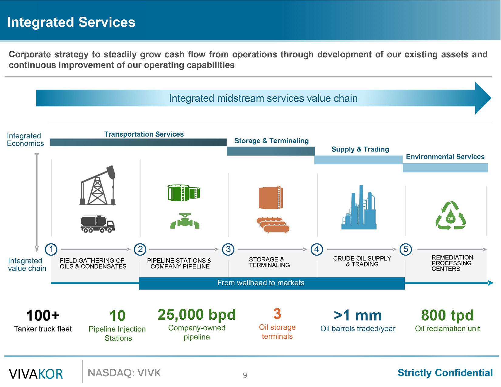 V i v ak o r h a s a s t r o n g a n d g r o w i n g p o r tf o l i o o f o i l g a t h e ri n g , s t or i n g , a n d l o g i s t i c s a ss e ts i n pr em i e r o i l pro d u c i n g b as i n s t h a t f o r m a c o m p e t i t i v e l y r obu s t, i n t e g r a t e d m i d s t r ea m v a l u e c h a i n Va l u e C r ea t i o n T h r oug h I n t eg r a t i on W e ha v e an oppo r t un i t y r i ch asset base wi t h o w ned i n f r as t r uc t u r e t hat t aken t oge t her r ep r esent a co m pe lli ng g r o w t h oppo r t un i t y A nada r k o Basin S T A C K P l a y ▪ C olorado C i t y Sw eet s tat ion ▪ C olorado C i t y W T I s tat ion ▪ P e c os R i v er E a s t Sw eet s tat ion ▪ P e c os R i v er W e s t Sw eet s tat ion ▪ E m pire AB O Sw eet s tat ion ▪ M onroe s tat ion ▪ W a s s on s tat ion ▪ M idland s tat ion ▪ W HG U s t a t ion ▪ M ary F o s t er s tat ion ▪ O m ega P ipeline S y s t em ▪ O k laho m a S t o r age Te rm i na l s P i pe li ne I n j ec t i on S t a t i ons G a t he r i ng P i pe li ne ▪ C u s hing, O k laho m a ▪ C olorado C i t y , T e x as ▪ D elhi , Loui s iana R e m ed i a t i on P r ocess i ng C en t e r s ▪ H ou s t on, T e x as Pe r m ian Basin U. S. G u lf Coast W orld’s Larg es t Crude O i l R e f ining a nd Terminaling Corridor Ea g l e Fo r d B as i n D e l h i Oil fi e l d Ha y ne s v i lle Basin 8 St ric t ly Conf i d e nt ial A sse t Footp r int N A S D A Q : V I VK VI V A