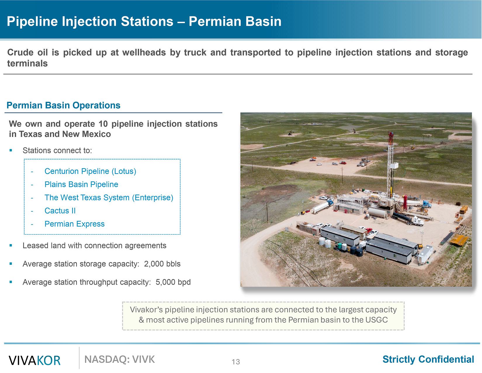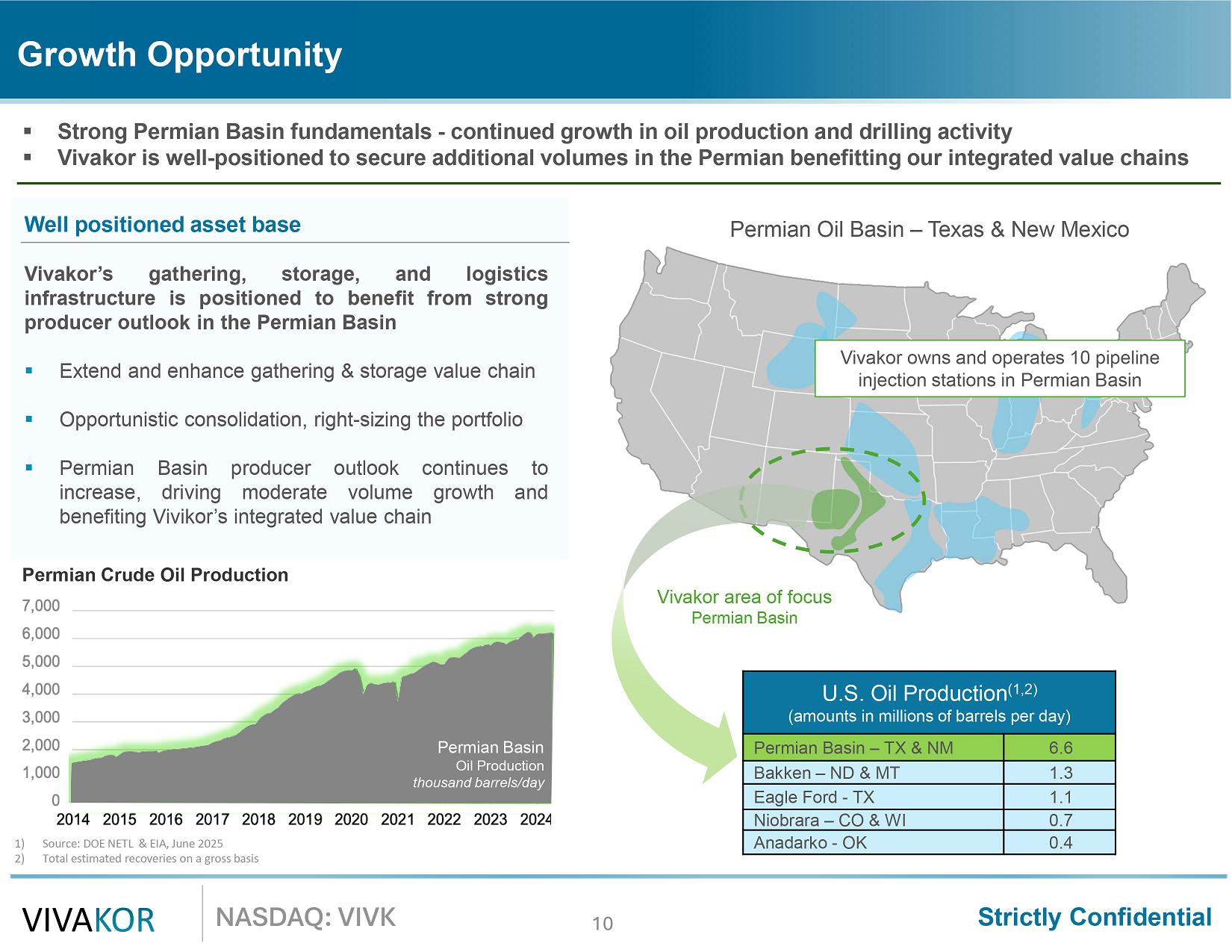 ▪ S t r on g Pe r m i a n B as i n f und ame n t a l s - c on t i nu e d g r o w t h i n o i l p r odu c t i o n a n d d rilli n g ac t i v i ty ▪ V i v ak o r i s w e l l - po s i t ion e d to sec u r e a dd i t i on a l v o l u me s i n t h e Pe r m i a n b e n e f i tt in g ou r i n t e g r a t e d v a l u e c h a i ns ▪ P e rm i a n B a sin p r odu c e r o u tl o o k c on ti n ue s to incr e as e , dr i vi n g mo d e r a te vol u me g r o wt h a n d bene f iti n g V i v iko r ’ s i n t eg r a t e d v a l u e c ha in Perm ia n C r ud e Oil P r odu c ti on V i v akor a r ea of f ocus Pe r mi an Ba s i n V i v akor o w ns and ope rat e s 10 p i pe li n e i n j ec ti on s tati ons i n P e r m i an B as i n W e l l po s i t i on e d asse t b as e V i v a k o r ’ s g a t he r i n g, s to r a g e , a n d l o g i s ti c s infr a st r u c t ure is p o s i t i o n e d t o b e n ef it f r om s tr o ng produc e r outlook in the P ermia n B as in ▪ E x t en d an d enhan ce ga t he ri n g & st o r ag e v a l u e c ha in ▪ Oppo rt unistic c on s o li da ti on , ri gh t - sizi n g t h e po rtfolio P e r m ia n Oil Ba s i n – T e x a s & N e w M e x i c o 1) S ource : DO E N ETL & EIA, Jun e 2025 2) T o t a l es t i m a t e d recoverie s o n a g ros s basis Pe r mi an Ba s i n O il P rodu c t ion t hou s and barrel s / day G r o w t h Oppo r tunity 10 St ric t ly Conf i d e nt ial N A S D A Q : V I VK VI V A U . S. Oil Pro du ct ion ( 1 , 2) ( a m oun t s i n milli ons of ba rr e l s per da y ) 6 . 6 Pe rm i a n Ba s i n – T X & NM 1 . 3 Ba kk e n – N D & M T 1 . 1 Ea g l e Fo rd - TX 0 . 7 Ni ob r a ra – C O & W I 0 . 4 Anada r k o - OK