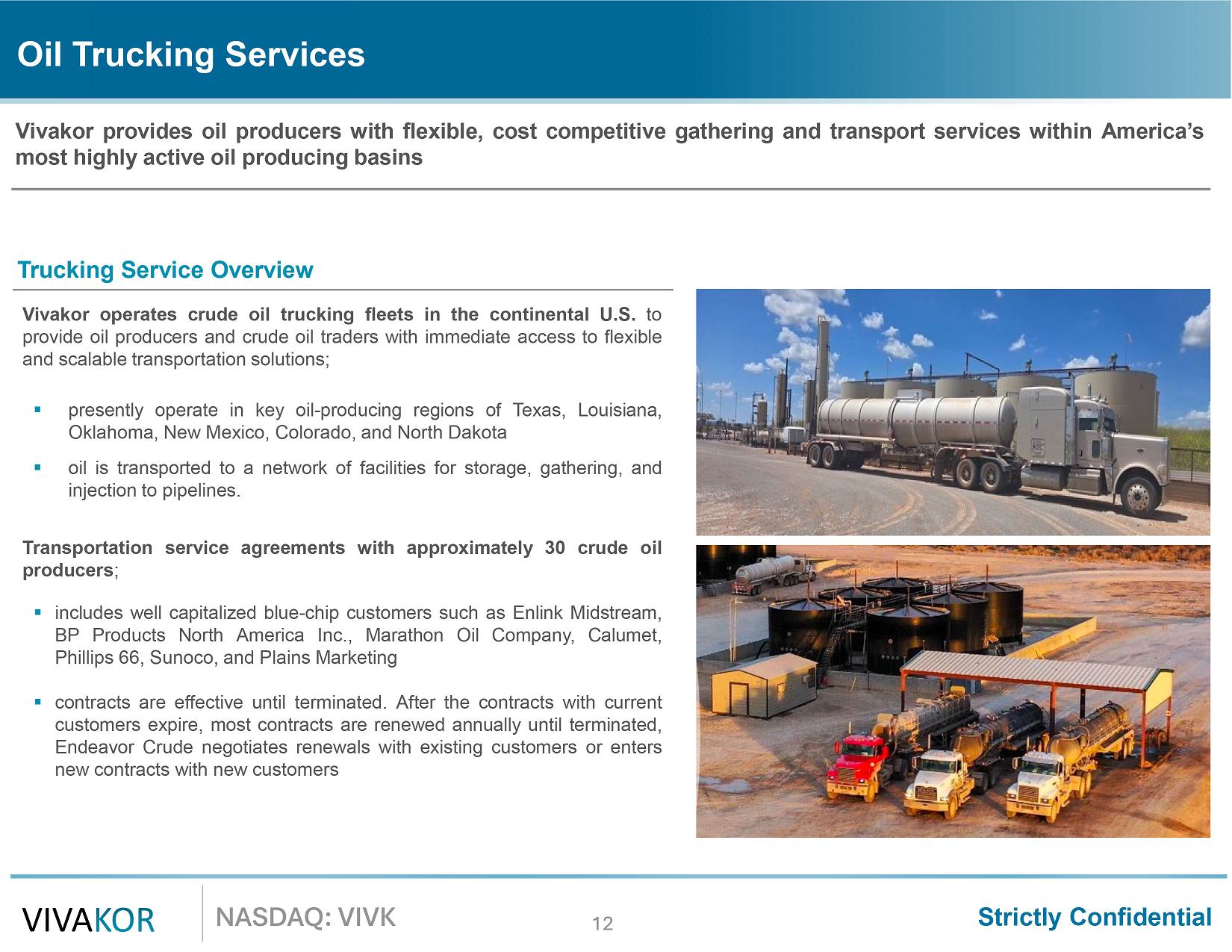 V i v ak o r p r o v i d e s oi l p r od u ce r s w i t h f l e x i b l e , c o s t c o m p e t i t i v e g a t h e r i n g a n d t r a n s p o r t s e r v i c e s w i t h i n A m e r i c a ’ s m o s t h i gh l y ac t i v e o i l p r odu c i n g b as i ns T r u ck i n g S e r v i c e O v e r v iew V i v ak o r op e ra t e s c rud e o il t r u c k i n g f l ee t s in th e c o n ti n e n ta l U . S . to p r o v i d e o i l p r od u c e r s a nd c r u de o i l tr a de r s w it h i m m e d i a t e ac c ess to f l e x i b l e and sca l ab l e tr anspo rtati on so luti ons ; ▪ p r e s e ntl y o p e r at e i n key o il - p r o duc i ng r e g i o ns o f T e x as , Lo u i s i a n a, O k l aho m a , N ew M e x i c o, C o l o r ado, and N o r t h D ak ot a ▪ o i l i s tr a n s p o rt e d to a net w o r k of f ac ili t i es fo r s t o r a g e, g a t h e ri n g , a nd i n j ec ti on to p i pe li n e s . T ra n s po rt a ti o n s e r v i c e a g r ee me n t s w i th a pp r o xi m a t e l y 30 cr ud e o il p r odu c ers ; ▪ i nc l u des w e l l c a p i t a li z e d b l u e - c h i p c us t o m e r s such as E n l i nk Mi d s tr e a m , BP P r o d uc t s N o r t h A m e ri ca In c . , M a r a t ho n O i l C o m p an y , C a l u m e t, P h illi ps 66 , S unoc o, and P l a i ns M a r k eti ng ▪ c o n tr a ct s a r e e f fe ct i v e u n ti l t e rmi n a te d . A f te r th e c ont r ac t s w it h c u rr e n t cus t o m e r s e x p i r e, m o s t cont r ac t s a r e r en e w e d annu a ll y unt i l t e r m i n at e d, Ende a v or Cr u d e n e go t i a t es r en e w a l s w it h e x i s ti ng cus t o m e r s or e nt e r s new cont r ac t s w it h new cus t o m e r s Oi l T r uckin g S e r vices 12 St ric t ly Conf i d e nt ial N A S D A Q : V I VK VI V A