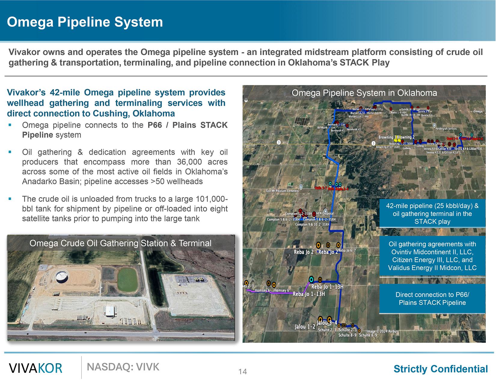 C r ud e o il is p i ck e d u p a t w e l l h e a d s b y tr u c k a n d tr a n s po r t e d to p i p e l i n e i n je c t i o n s t a t i on s a n d s t o r a g e t e r mi n a ls P e r mi a n B as in Op e r a t i ons W e o w n a n d o p e r a te 1 0 p i p e l i n e i n j ec t i o n s t a t i o n s i n T exa s a n d N e w M ex i c o ▪ Statio n s c onne ct t o : - C en t u ri o n Pi pelin e ( Lo t u s) - Pl ain s B a sin Pi peline - T h e W e st T e x a s S y st em (Enterprise) - Cactu s II - P e rmian E x press ▪ Lea s e d l an d w ith c onne cti o n ag r eemen ts ▪ A v e r ag e st a tion st o r ag e c apacit y : 2 , 00 0 bb ls ▪ A v e r ag e st a tion t h r oughpu t ca pacit y : 5 , 00 0 bpd P ipelin e Injectio n S tation s – P e rm ia n B asi n 13 St ric t ly Conf i d e nt ial N A S D A Q : V I VK VI V A V i v a k o r ’ s pi pe l i n e i n j e c t i o n s t a t i o n s a r e c o nn e c t ed t o th e l a r g e s t c ap a c i t y & m o s t a c t i v e pi pe l i n es r u nn i n g f r om th e P e r m i a n b a s i n t o th e U S G C