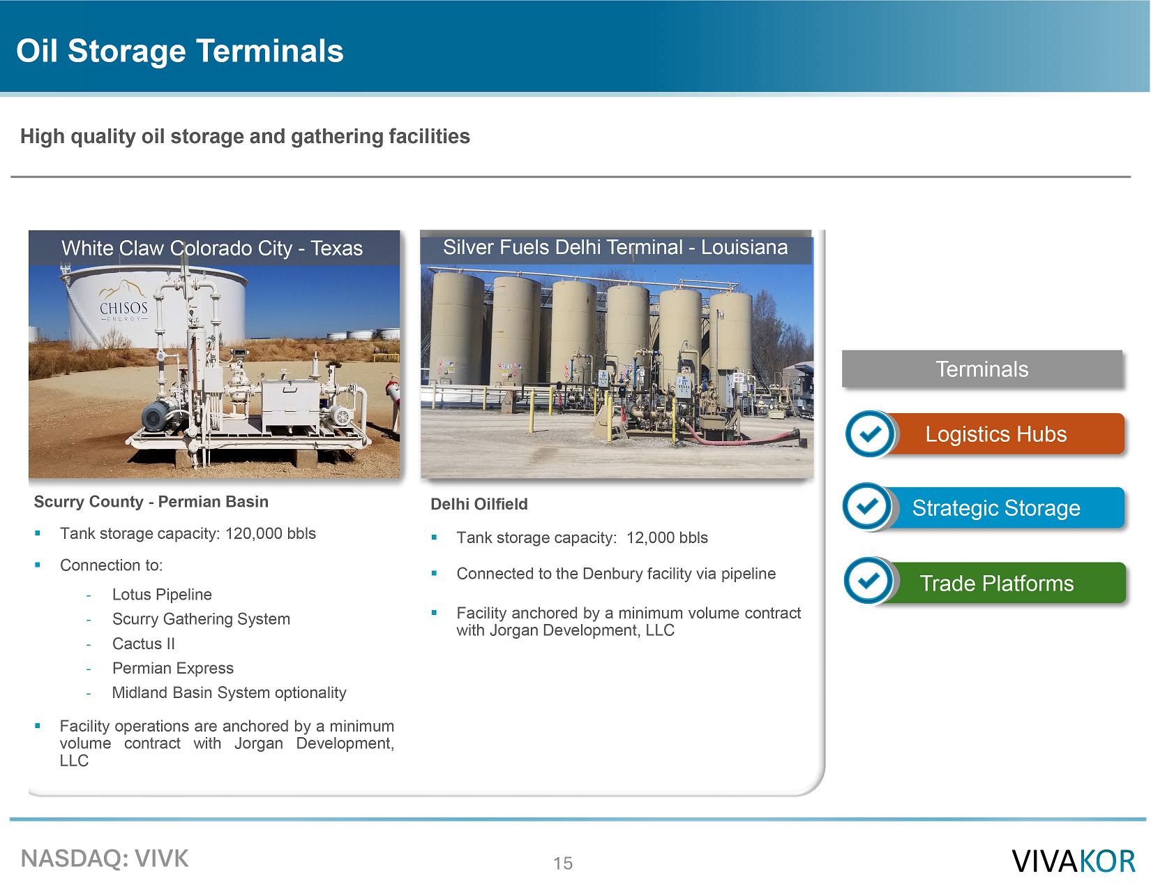V i v ak o r o w n s a n d op e r a t e s t h e O m e g a p i p e l i n e s y s t e m - a n i n t e gr a t e d m i d s t r e a m p l a t f or m c o n s i s t i n g o f c rud e oi l g a t h e ri n g & t r a n s po r t a t ion , t e r m i n a li n g , a n d p i p e li n e c onn ec t i o n i n O k l a ho ma ’ s S T A C K P l a y Di r ect c onnec t i on t o P66/ P l a i ns STA C K P i pe li ne 42 - mil e p i pe li ne ( 25 k bbl / da y ) & o i l ga t he r i ng t e r mi nal i n t he STA C K p l ay O m eg a P i pe li n e S y st e m in O k l aho m a V i v ak o r ’ s 4 2 - m i l e Om e g a p i p e l i n e s y s t e m p r o v i d e s w e l l h ea d g a t h e r i n g a n d t e r m i n a l i n g s e r v i c e s w i th d ir ec t c onn ec t i o n to Cu s h i ng , O k l a ho m a ▪ Om e g a p i p e li n e c o n ne cts to t h e P 6 6 / Plai n s S T A C K Pip e line s y stem ▪ Oil g a t h e r i n g & de d ic a t i o n a g r e e m en t s w ith k e y o il p r o du c e rs t ha t en c om p a ss m o re t ha n 36 , 0 0 0 a c r e s acr o ss s o me o f t h e most a ct i v e o il fi el d s in Okl a h o m a ’ s Anada rko B a si n ; p i pe li n e a ccesses > 5 0 w e ll head s ▪ T h e c r u d e o il is un l o ad e d fr o m t r u cks t o a l a r g e 1 0 1 , 0 0 0 - bb l t an k f o r s h i p m e n t b y p i pe l i n e o r o f f - l o ad e d i n t o e i gh t satellite t an ks p ri o r to pump i n g into t h e l a r g e t an k O i l ga t he r i ng ag r ee m en t s w i t h O v i n t i v M i dcon t i nent II , LL C , Ci t i z en Ene r gy III , LL C , and Va li dus Ene r gy I I M i dcon, LLC O m eg a P ipelin e S y stem 14 St ric t ly Conf i d e nt ial N A S D A Q : V I VK VI V A O m eg a C r ud e Oil G a t he ri n g S t a t i o n & T e r m i na l