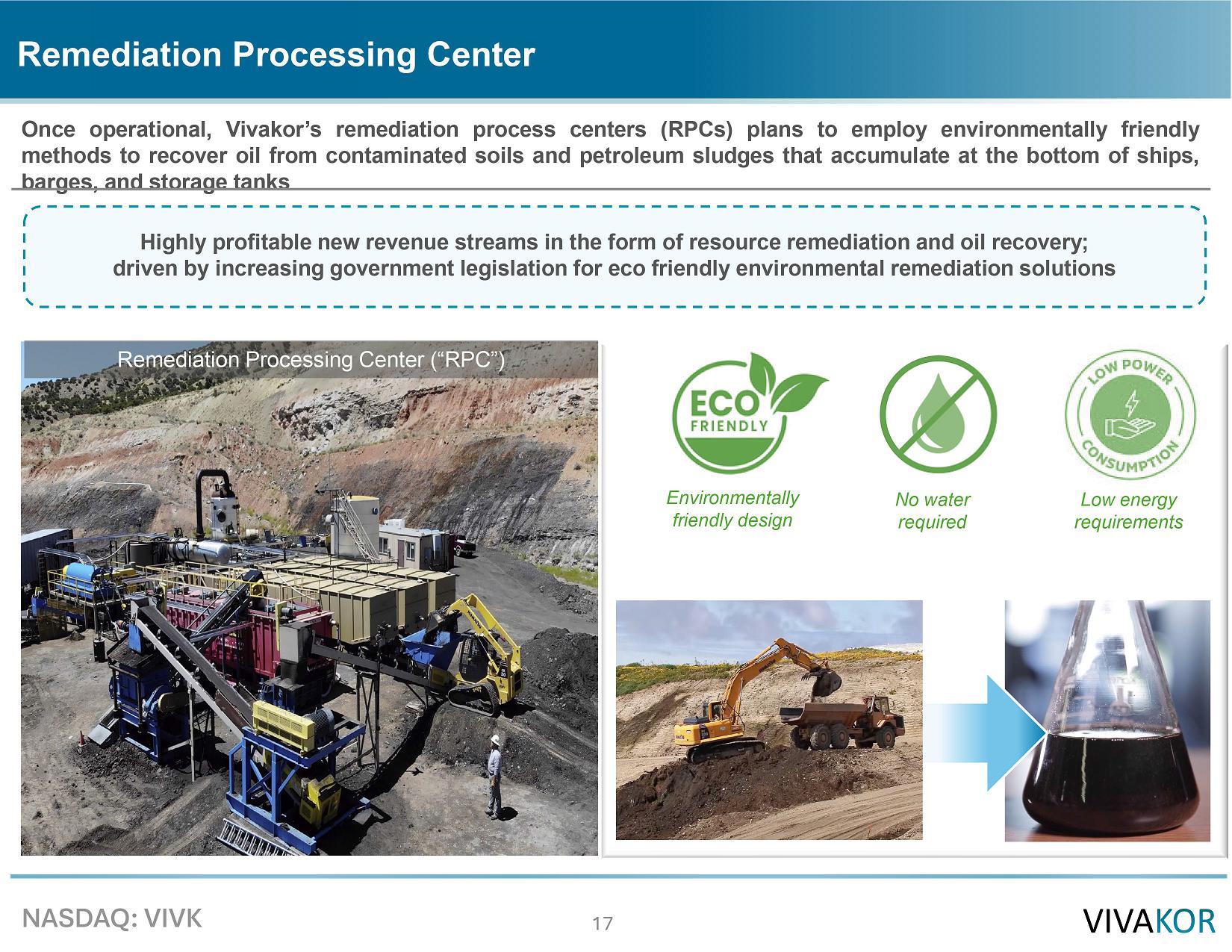 O n c e o p e r a t ion a l , V i v a k o r ’ s r eme d i a t i o n pro c e s s c e n t e r s ( R P C s ) pl a n s to em p lo y e n v ir on me n t a l l y f r i e nd l y me t ho d s to r e c o v e r oi l f ro m c on ta m i n a t e d s oi l s a n d p e t r o l e u m s l u d g e s t h a t a cc u m u l at e a t t h e b o tt o m o f s h i p s , b a r g es, a nd s t o r a ge t a n ks H i gh l y p r o f i t a b l e n e w r e v e nu e s t r eam s i n t h e f o r m o f r es ou r c e r eme d i a t io n a n d o i l r ec o v e r y ; d ri v e n b y i n c r eas i n g go v e r n me n t l e g i s l a t i o n f o r ec o f ri e nd l y e n v ir on me n t a l r eme d i a t io n s o l u t i ons R e m ed i a t i o n P r o c e ss i n g C en t e r (“ R P C ”) R e m ediatio n Pr ocessin g C enter 17 N A S D A Q : V I VK VI V A N o w at er r equ ir ed Env ir on m enta l l y fri end l y des i gn Low ene r gy r equ ir e m ents