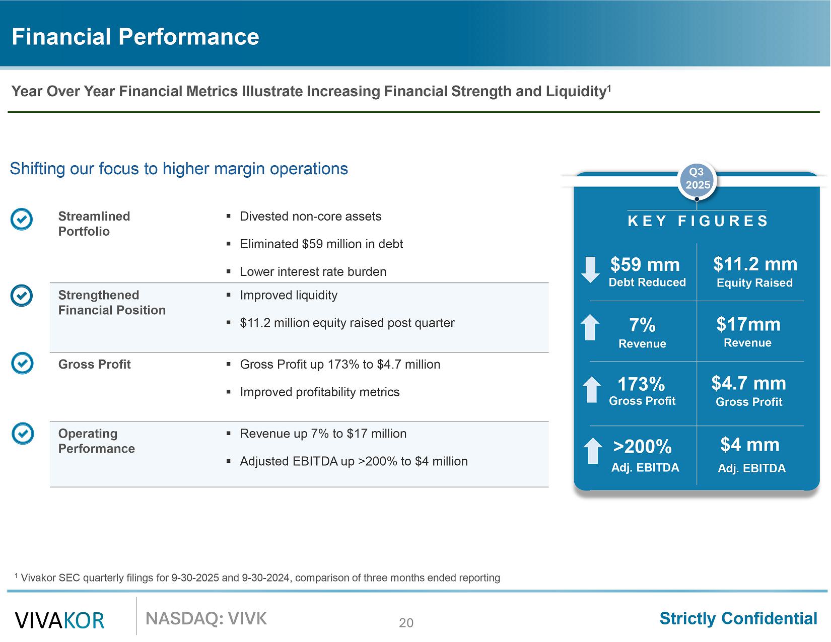 Y ea r O v e r Y ea r F i n a n c i a l M e t r i c s Ill u s t r a te I n c r eas i n g F i n a n c i a l St r e ng th a n d L i qu i d i t y 1 Financia l P e r fo r m ance 202 5 K E Y F I G U R E S $5 9 m m D eb t R educed $ 1 1 . 2 m m Equ i ty R a i sed > 200% A d j . E B I T D A 7% R e v enue $ 4 m m A d j . E B I T D A $17 m m R e v enue 20 St ric t ly Conf i d e nt ial N A S D A Q : V I VK VI V A Sh i ft i n g ou r fo c u s to h i ghe r marg i n operat i ons Q3 1 Viva k o r SE C qua r te r l y f iling s f o r 9 - 30 - 202 5 an d 9 - 30 - 2024 , c o m pa r i s o n o f th r e e m onth s ende d r epo r t ing 173% G r os s P r o f i t $4 .7 m m G r os s P r o f i t ▪ Di v ested non - co r e assets ▪ E li m i nat e d $59 m illi on i n debt ▪ Lo w er i nte r est r ate bu r den S t reamli n ed P o r tfo lio ▪ I m p r o v ed li q u i d i ty ▪ $ 1 1.2 m illi on e q u i ty r a i sed post q ua r ter S t re ngth e n ed F i n a n cial P o si t i on ▪ G r oss P r o f i t up 173% to $4.7 m illi on ▪ I m p r o v ed p r o f i ta b ili ty m et ri cs Gr o ss Pr of it ▪ R e v enue up 7% to $17 m illi on ▪ Ad j usted EBI T D A up > 200% to $4 m illi on O p era t i ng Per fo rma n ce