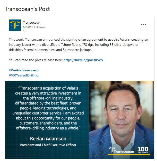 This communication does not constitute an offer to buy, or the solicitation of an offer to sell, any securities, nor shall there be any sale of securities in any jurisdiction in which such offer or sale would be unlawful prior to registration or qualification under the securities laws of any such jurisdiction. This communication is not a substitute for the joint proxy statement or any other document that Transocean or Valaris may file with the SEC and send to their respective shareholders in connection with the proposed transaction. Investors and shareholders will be able to obtain free copies of the joint proxy statement (when available) and other documents filed with the SEC by Transocean or Valaris through the website maintained by the SEC at http://www.sec.gov. Copies of the documents filed with the SEC by Transocean will be available free of charge on Transocean’s website at www.deepwater.com under the tab “Investors” and under the heading “SEC Filings.” Copies of the documents filed with the SEC by Valaris will be available free of charge on Valaris’ website at www.valaris.com under the tab “Investors” and under the heading “Financials” and subheading “SEC Filings.”