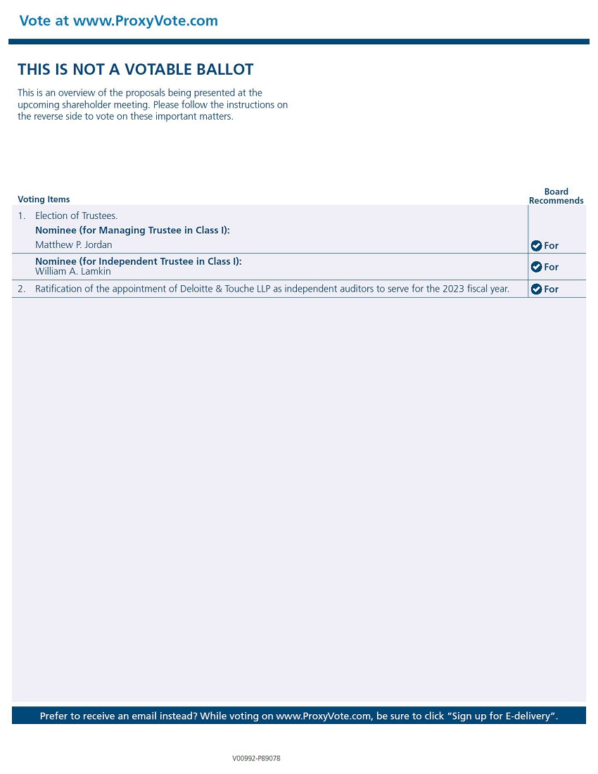 Vote at www.ProxyVote.comTHIS IS NOT A VOTABLE BALLOT This is an overview of the proposals being presented at the upcoming shareholder meeting. Please follow the instructions on the reverse side to vote on these important matters.Voting Items 1. Election of Trustees. Nominee (for Managing Trustee in Class I): Matthew P. Jordan Nominee (for Independent Trustee in Class I): William A. Lamkin 2. Ratification of the appointment of Deloitte & Touche LLP as independent auditors to serve for the 2023 fiscal year.Board RecommendsFor For ForPrefer to receive an email instead? While voting on www.ProxyVote.com, be sure to click “Sign up for E-delivery”.V00992-P89078