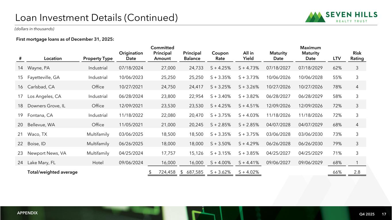 Q4 2025 17 First mortgage loans as of December 31, 2025: # Location Property Type Origination Date Committed Principal Amount Principal Balance Coupon Rate All in Yield Maturity Date Maximum Maturity Date LTV Risk Rating 14 Wayne, PA Industrial 07/18/2024 27,000 24,733 S + 4.25% S + 4.73% 07/18/2027 07/18/2029 62% 3 15 Fayetteville, GA Industrial 10/06/2023 25,250 25,250 S + 3.35% S + 3.73% 10/06/2026 10/06/2028 55% 3 16 Carlsbad, CA Office 10/27/2021 24,750 24,417 S + 3.25% S + 3.26% 10/27/2026 10/27/2026 78% 4 17 Los Angeles, CA Industrial 06/28/2024 23,800 22,954 S + 3.40% S + 3.82% 06/28/2027 06/28/2029 58% 3 18 Downers Grove, IL Office 12/09/2021 23,530 23,530 S + 4.25% S + 4.51% 12/09/2026 12/09/2026 72% 3 19 Fontana, CA Industrial 11/18/2022 22,080 20,470 S + 3.75% S + 4.03% 11/18/2026 11/18/2026 72% 3 20 Bellevue, WA Office 11/05/2021 21,000 20,245 S + 2.85% S + 2.85% 04/07/2028 04/07/2029 68% 4 21 Waco, TX Multifamily 03/06/2025 18,500 18,500 S + 3.35% S + 3.75% 03/06/2028 03/06/2030 73% 3 22 Boise, ID Multifamily 06/26/2025 18,000 18,000 S + 3.50% S + 4.29% 06/26/2028 06/26/2030 79% 3 23 Newport News, VA Multifamily 04/25/2024 17,757 15,126 S + 3.15% S + 3.85% 04/25/2027 04/25/2029 71% 3 24 Lake Mary, FL Hotel 09/06/2024 16,000 16,000 S + 4.00% S + 4.41% 09/06/2027 09/06/2029 68% 1 Total/weighted average $ 724,458 $ 687,585 S + 3.62% S + 4.02% 66% 2.8 Loan Investment Details (Continued) (dollars in thousands) APPENDIX