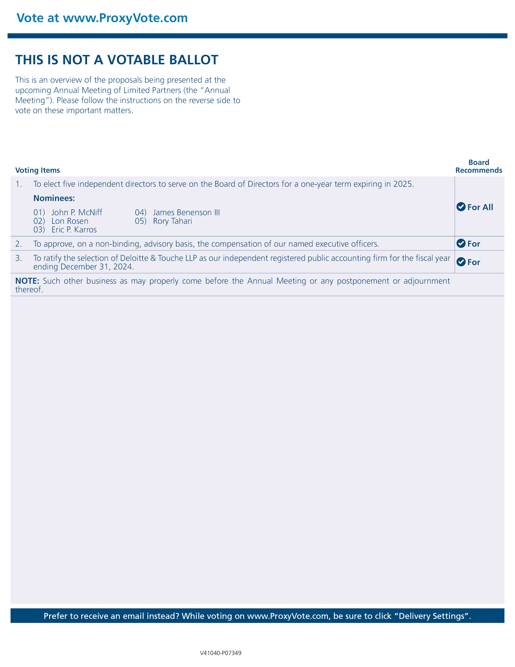 Vote at www.ProxyVote.com THIS IS NOT A VOTABLE BALLOT This is an overview of the proposals being presented at the upcoming Annual Meeting of Limited Partners (the “Annual Meeting”). Please follow the instructions on the reverse side to vote on these important matters. Voting Items Board Recommends 1. To elect five independent directors to serve on the Board of Directors for a one-year term expiring in 2025. Nominees: 01) John P. McNiff 02) Lon Rosen 03) Eric P. Karros 04) James Benenson III 05) Rory Tahari For All 2. To approve, on a non-binding, advisory basis, the compensation of our named executive officers. 3. To ratify the selection of Deloitte & Touche LLP as our independent registered public accounting firm for the fiscal year ending December 31, 2024. For NOTE: Such other business as may properly come before the Annual Meeting or any postponement or adjournment thereof. Prefer to receive an email instead? While voting on www.ProxyVote.com, be sure to click “Delivery Settings”. V41040-P07349