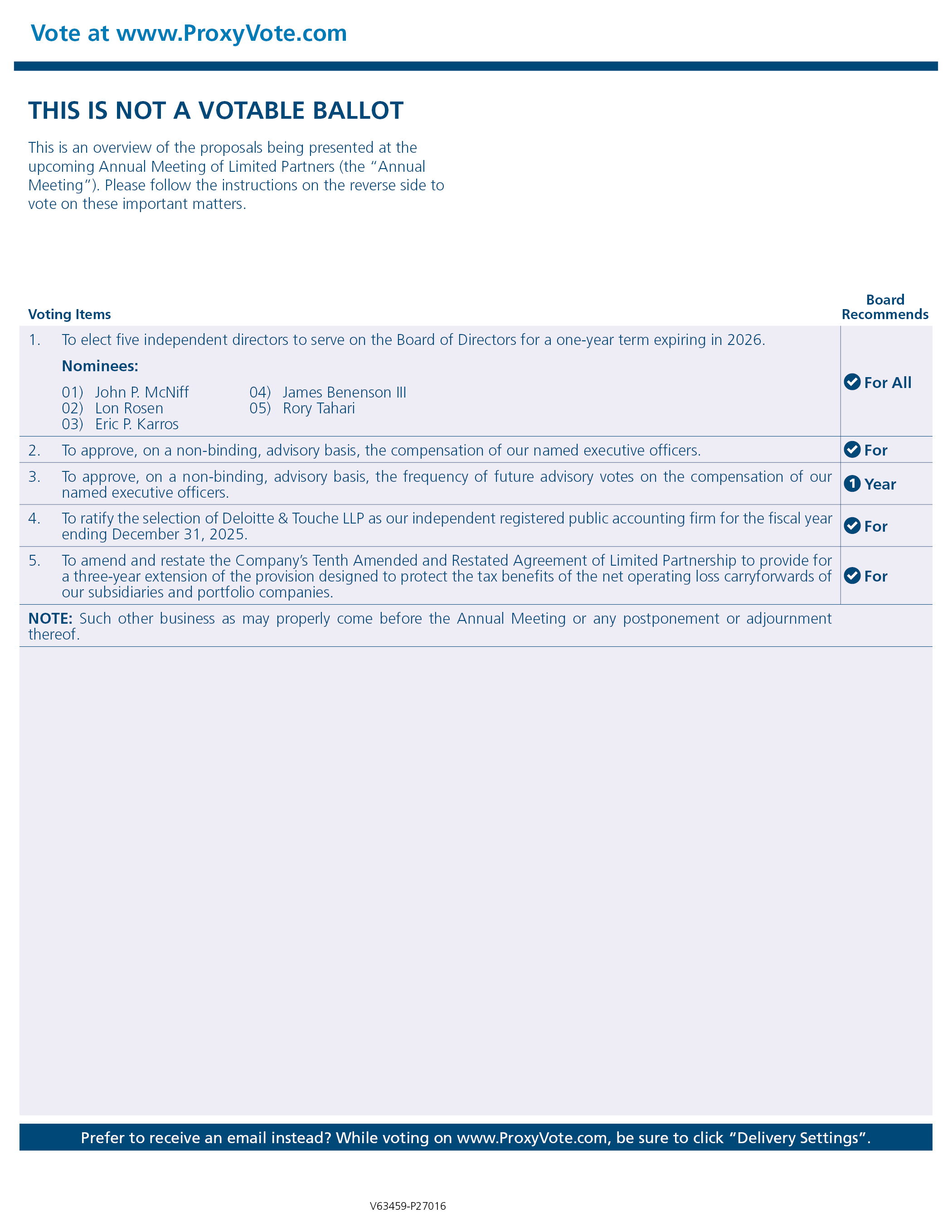 Vote at www.ProxyVote.com THIS IS NOT A VOTABLE BALLOT This is an overview of the pro-posals being presented at the upcoming Annual Meeting of Limited Partners (the “Annual Meeting”). Please follow the instructions on the reverse side to vote on these important matters. Voting Items 1. To elect five independent directors to serve on the Board of Direc-tors for a one-year term expiring in 2026. Nominees: 01) John P. McNiff 02) Lon Rosen 03) Eric P. Karros 04) James Benenson III 05) Rory Tahari Board Recommends For All 2. To approve, on a non-binding, advisory basis, the compensation of our named executive officers. For 3. To approve, on a non-binding, advisory basis, the frequency of future advisory votes on the com-pensation of our named executive officers. 1 Year 4. To ratify the selection of Deloitte & Touche LLP as our independent registered public accounting firm for the fiscal year ending December 31, 2025. For 5. To amend and restate the Company’s Tenth Amended and Restated Agreement of Limited Partnership to provide for a three-year extension of the provision designed to protect the tax benefits of the net operating loss carryforwards of our subsidiaries and portfolio compa-nies. For NOTE: Such other business as may properly come before the Annual Meeting or any postponement or adjournment thereof. Prefer to receive an email instead? While voting on www.ProxyVote.com, be sure to click “Delivery Settings”. V63459-P27016