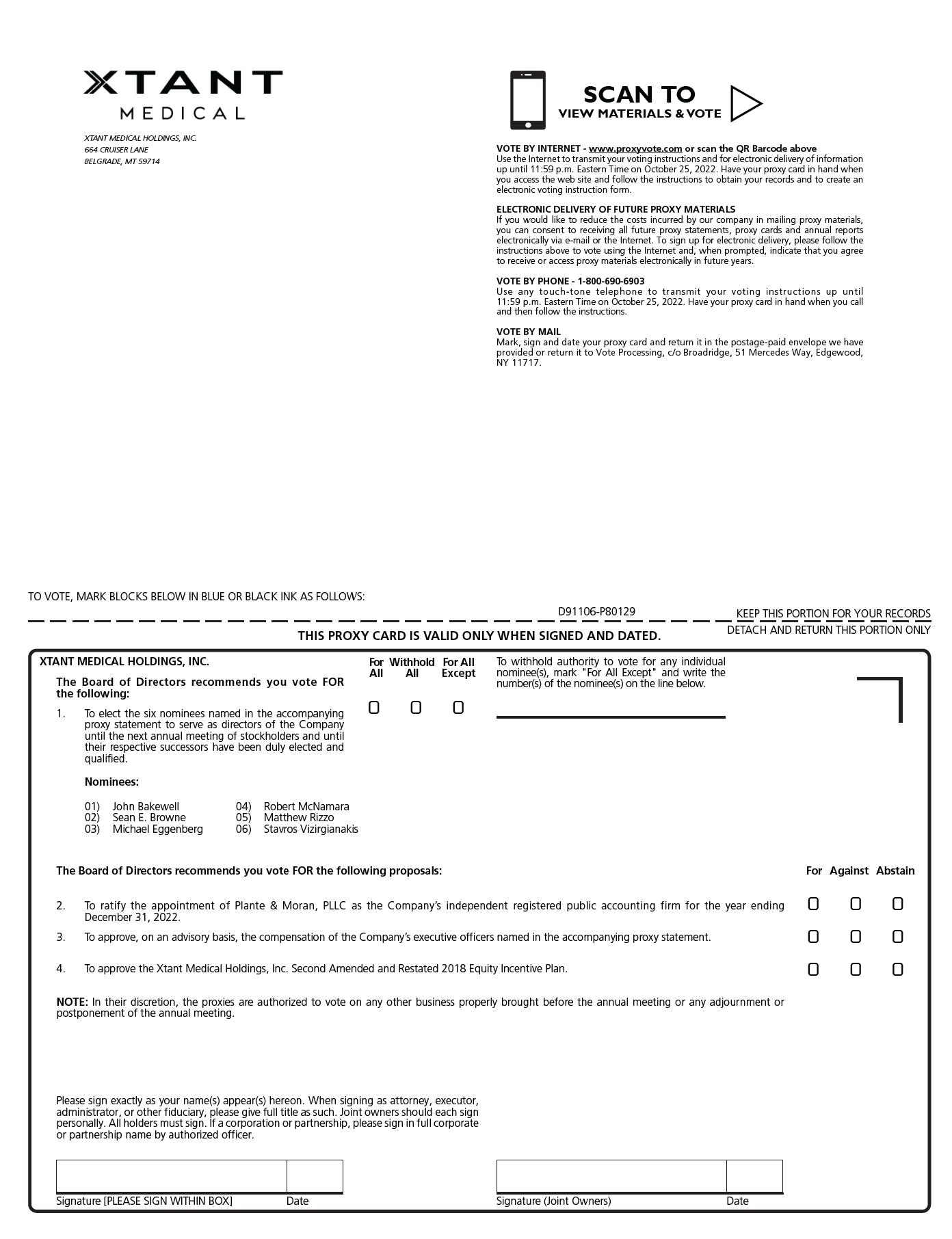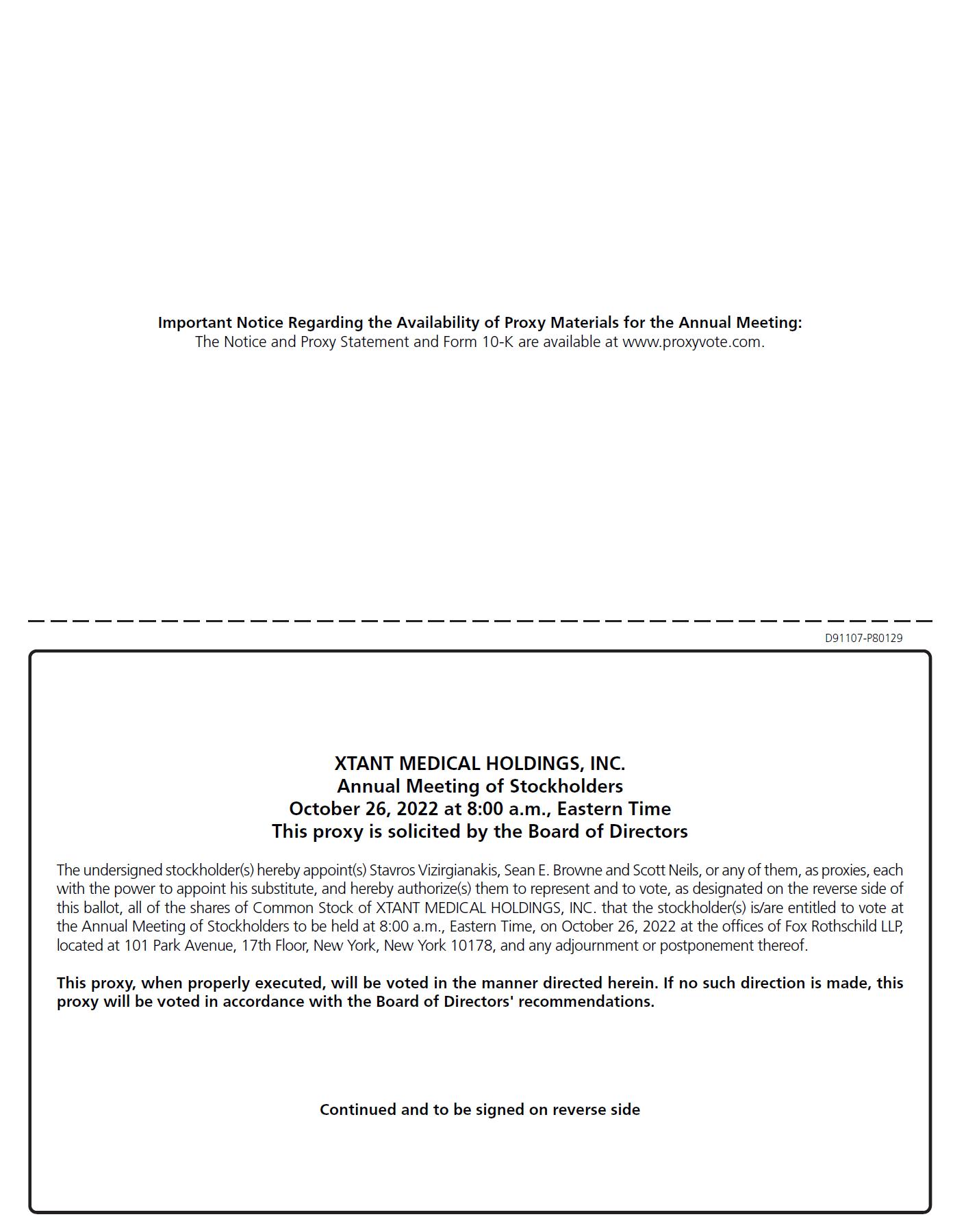 You are invited to attend the Annual Meeting of Stockholders (“Annual Meeting”) of Xtant Medical Holdings, Inc. (the “Company”) on October 26, 2022 at 8:00 a.m., Eastern Time, at the offices of Fox Rothschild LLP, located at 101 Park Avenue, 17th Floor, New York, New York 10178, for the following purposes: