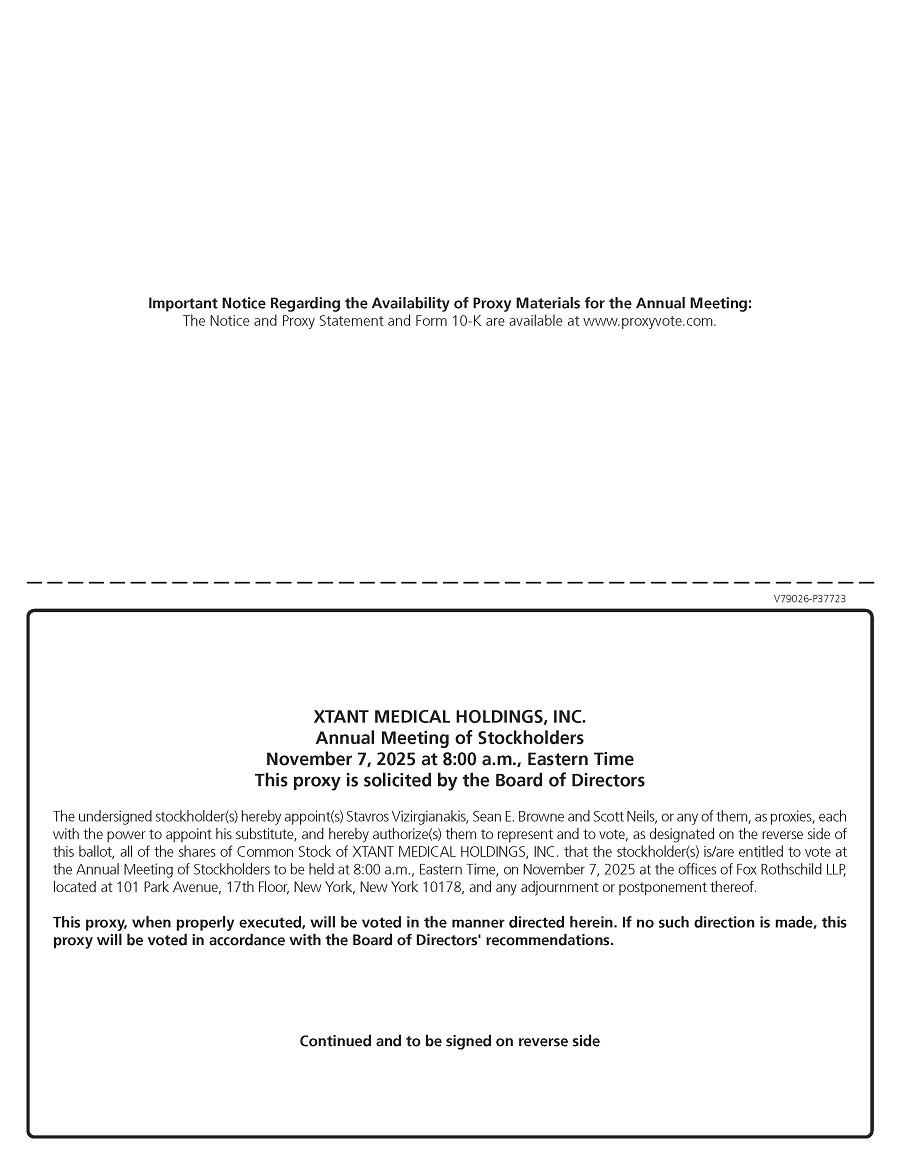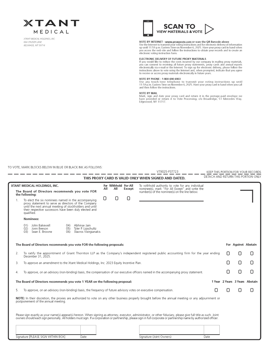 You are invited to attend the Annual Meeting of Stockholders of Xtant Medical Holdings, Inc. on November 7, 2025 at 8:00 a.m., Eastern Time, at the offices of Fox Rothschild LLP, located at 101 Park Avenue, 17th Floor, New York, New York 10178, for the following purposes: