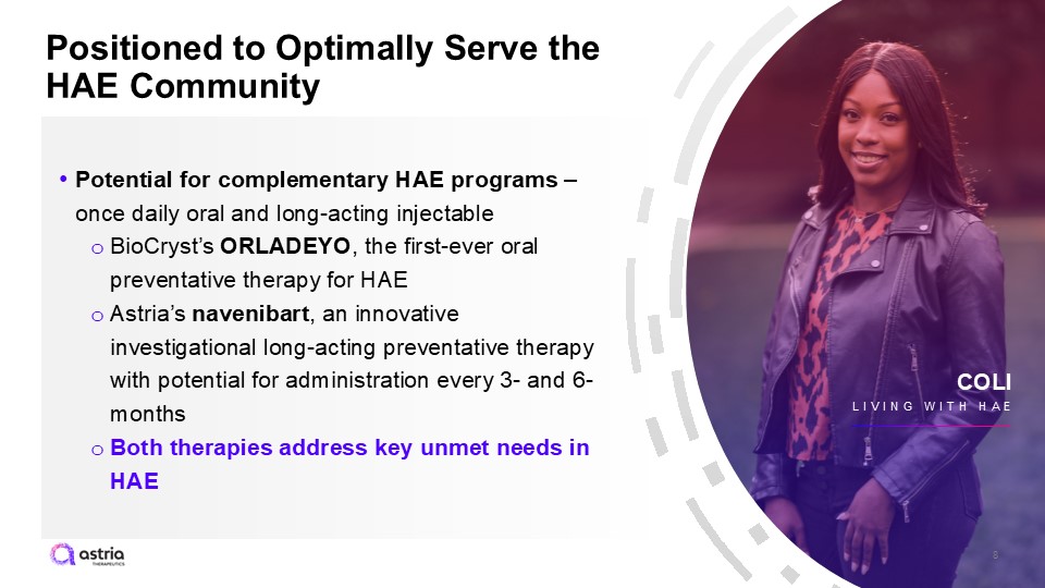 BioCryst’s commercial footprint primed for next product 7 Commercial strategy for ORLADYEO is a repeatable playbook for navenibart Patients & HAEA Physicians & KOLs Single source specialty pharmacy Payers x Robust market understanding through market research, data, and insights Deep understanding of patient, provider, and payer preferences confirm demand for a long - acting injectable x Strong stakeholder relationships With past and present ORLADEYO patients, providers, patient advocacy organizations, and payers >90% of patients who have discontinued ORLADEYO have given marketing communications permission x Proven ability to execute Commercial engine has developed sustainable competitive advantages; will apply the same playbook to navenibart Experienced rare disease sales team Proven patient services platform State - of - the art data analytics Differentiated commercialization infrastructure