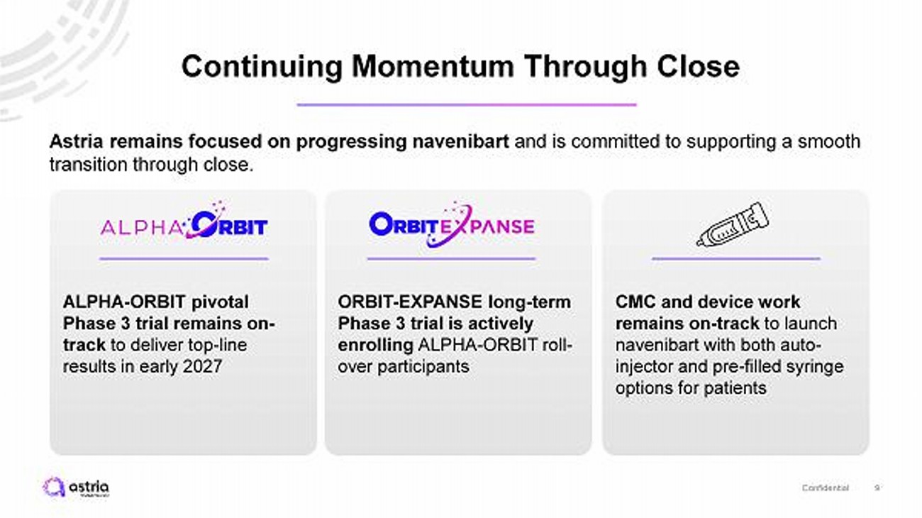 ALPHA - ORBIT pivotal Phase 3 trial remains on - track to deliver top - line results in early 2027 ORBIT - EXPANSE long - term Phase 3 trial is actively enrolling ALPHA - ORBIT roll - over participants CMC and device work remains on - track to launch navenibart with both auto - injector and pre - filled syringe options for patients Continuing Momentum Through Close Confidential 9 Astria remains focused on progressing navenibart and is committed to supporting a smooth transition through close.