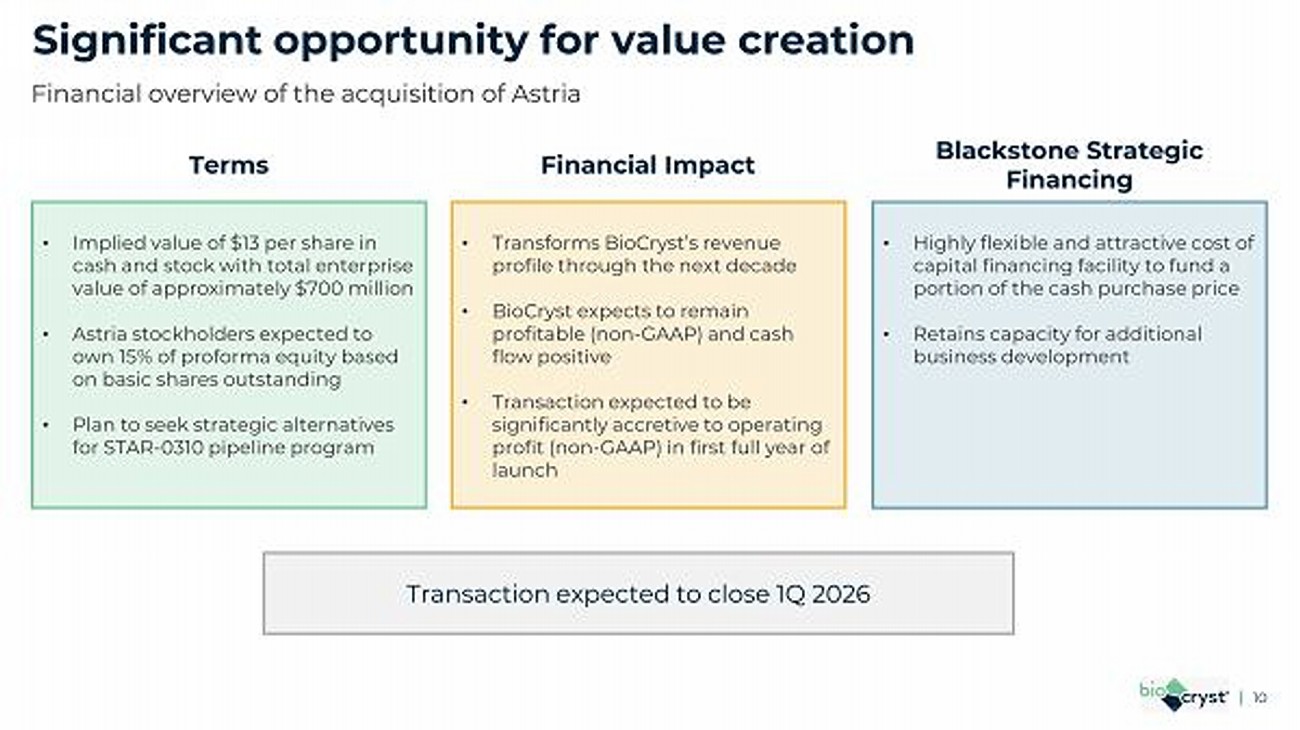 2 Important Additional Information will be Filed with the SEC In connection with the proposed transaction, BioCryst Pharmaceuticals, Inc. (“BioCryst”) will file with the U.S. Securities a nd Exchange Commission (the “SEC”) a registration statement on Form S - 4 (the “registration statement”), which will contain a proxy statement of Astria Thera peutics, Inc. (“Astria”) and a prospectus of BioCryst (the “proxy statement/prospectus”), and each of BioCryst and Astria may file with the SEC other releva nt documents regarding the proposed transaction. INVESTORS AND SECURITY HOLDERS ARE URGED TO READ THE REGISTRATION STATEMENT AND THE PROXY STATEMENT/PROSPECTUS CAREFULLY AND IN THEIR ENTIRETY AND ANY OTHER RELEVANT DOCUMENTS FILED WITH THE SEC BY BIOCRYST AND ASTRIA, AS WELL AS ANY AMENDMENTS OR SUPPLEMENTS TO THOSE DOCUMENTS WHEN THEY BECOME AVAILABLE BECAUSE THEY WILL CONTAIN IMPORTANT INFORMATION ABOUT BIOCRYST, ASTRIA AND THE POTENTIAL ACQUISITION OF ASTRIA BY BIOCRYST (THE “TRANSACTION”). When f ina l, a definitive copy of the proxy statement/prospectus will be mailed to Astria stockholders. Investors and security holders will be able to obtain the registration statement and the proxy statement/prospectus, as well as other filings containing information about BioCryst and Astria, free of charge from BioCryst or Astria or from the SEC’s website when they are filed. The documents filed by BioCryst with the SEC may be obtained free of charge a t B ioCryst’s website, at www.biocryst.com, or by requesting them by mail at BioCryst Pharmaceuticals, Inc., 4505 Emperor Boulevard, Suite 200, Durham, No rth Carolina 27703, Attention: Corporate Secretary. The documents filed by Astria with the SEC may be obtained free of charge at Astria’s website , a t www.astriatx.com, or by requesting them by mail at Astria Therapeutics, Inc., 22 Boston Wharf Road, 10th Floor, Boston, Massachusetts, 02210, Attenti on: Investor Relations. The information included on BioCryst’s and Astria’s websites is not incorporated by reference into this press release. Participants in the Solicitation BioCryst and Astria and certain of their respective directors and executive officers may be deemed to be participants in the sol icitation of proxies from the stockholders of Astria in respect of the proposed transaction. Information about BioCryst’s directors and executive officers is available in BioCryst’s proxy statement, dated April 24, 2025, for its 2025 Annual Meeting of Stockholders, and other documents filed by BioCryst with the SEC . Information about Astria’s directors and executive officers is available in Astria’s proxy statement, dated April 28, 2025, for its 2025 Annual Meeting of Stockholders, and other documents filed by Astria with the SEC. Other information regarding the persons who may, under the rules of the SEC, be deemed particip ant s in the proxy solicitation and a description of their direct and indirect interests, by security holdings or otherwise, will be contained in the proxy state men t/prospectus and other relevant materials to be filed with the SEC regarding the proposed transaction when they become available. Investors should read the p rox y statement/prospectus carefully when it becomes available before making any voting or investment decisions. You may obtain free copies of these do cum ents from BioCryst or Astria as indicated above. Important Information