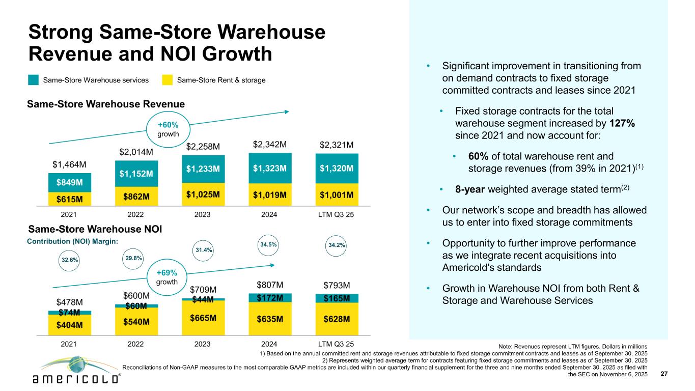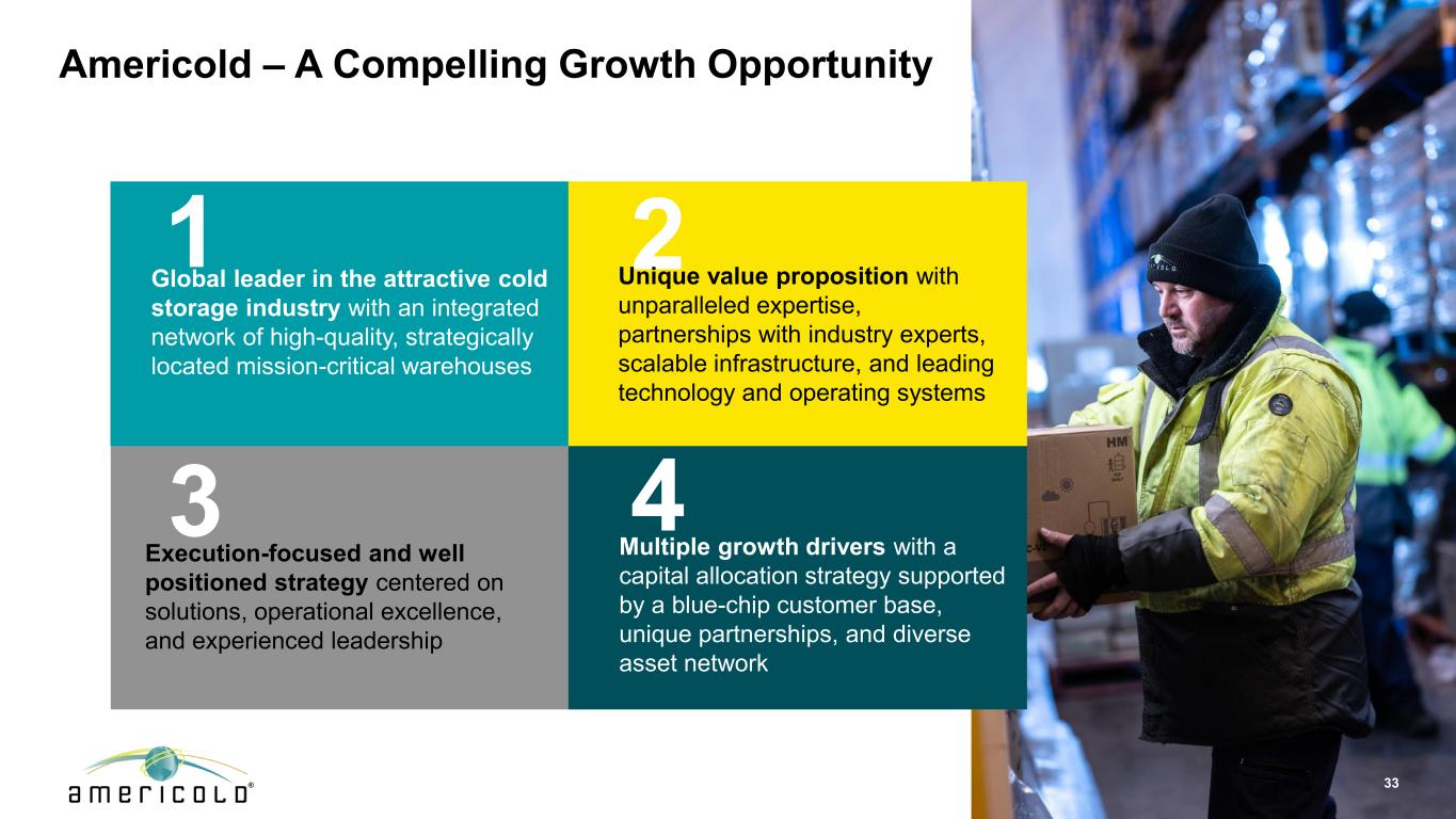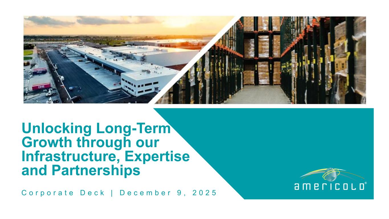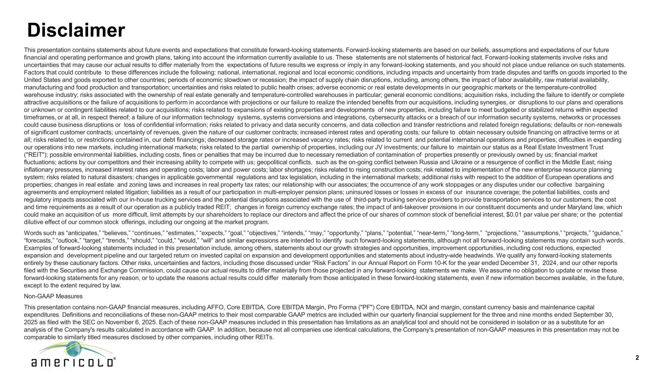Disclaimer This presentation contains statements about future events and expectations that constitute forward-looking statements. Forward-looking statements are based on our beliefs, assumptions and expectations of our future financial and operating performance and growth plans, taking into account the information currently available to us. These statements are not statements of historical fact. Forward-looking statements involve risks and uncertainties that may cause our actual results to differ materially from the expectations of future results we express or imply in any forward-looking statements, and you should not place undue reliance on such statements. Factors that could contribute to these differences include the following: national, international, regional and local economic conditions, including impacts and uncertainty from trade disputes and tariffs on goods imported to the United States and goods exported to other countries; periods of economic slowdown or recession; the impact of supply chain disruptions, including, among others, the impact of labor availability, raw material availability, manufacturing and food production and transportation; uncertainties and risks related to public health crises; adverse economic or real estate developments in our geographic markets or the temperature-controlled warehouse industry; risks associated with the ownership of real estate generally and temperature-controlled warehouses in particular; general economic conditions; acquisition risks, including the failure to identify or complete attractive acquisitions or the failure of acquisitions to perform in accordance with projections or our failure to realize the intended benefits from our acquisitions, including synergies, or disruptions to our plans and operations or unknown or contingent liabilities related to our acquisitions; risks related to expansions of existing properties and developments of new properties, including failure to meet budgeted or stabilized returns within expected timeframes, or at all, in respect thereof; a failure of our information technology systems, systems conversions and integrations, cybersecurity attacks or a breach of our information security systems, networks or processes could cause business disruptions or loss of confidential information; risks related to privacy and data security concerns, and data collection and transfer restrictions and related foreign regulations; defaults or non-renewals of significant customer contracts; uncertainty of revenues, given the nature of our customer contracts; increased interest rates and operating costs; our failure to obtain necessary outside financing on attractive terms or at all; risks related to, or restrictions contained in, our debt financings; decreased storage rates or increased vacancy rates; risks related to current and potential international operations and properties; difficulties in expanding our operations into new markets, including international markets; risks related to the partial ownership of properties, including our JV investments; our failure to maintain our status as a Real Estate Investment Trust ("REIT"); possible environmental liabilities, including costs, fines or penalties that may be incurred due to necessary remediation of contamination of properties presently or previously owned by us; financial market fluctuations; actions by our competitors and their increasing ability to compete with us; geopolitical conflicts, such as the on-going conflict between Russia and Ukraine or a resurgence of conflict in the Middle East; rising inflationary pressures, increased interest rates and operating costs; labor and power costs; labor shortages; risks related to rising construction costs; risk related to implementation of the new enterprise resource planning system; risks related to natural disasters; changes in applicable governmental regulations and tax legislation, including in the international markets; additional risks with respect to the addition of European operations and properties; changes in real estate and zoning laws and increases in real property tax rates; our relationship with our associates; the occurrence of any work stoppages or any disputes under our collective bargaining agreements and employment related litigation; liabilities as a result of our participation in multi-employer pension plans; uninsured losses or losses in excess of our insurance coverage; the potential liabilities, costs and regulatory impacts associated with our in-house trucking services and the potential disruptions associated with the use of third-party trucking service providers to provide transportation services to our customers; the cost and time requirements as a result of our operation as a publicly traded REIT; changes in foreign currency exchange rates; the impact of anti-takeover provisions in our constituent documents and under Maryland law, which could make an acquisition of us more difficult, limit attempts by our shareholders to replace our directors and affect the price of our shares of common stock of beneficial interest, $0.01 par value per share; or the potential dilutive effect of our common stock offerings, including our ongoing at the market program. Words such as “anticipates,” “believes,” “continues,” “estimates,” “expects,” “goal,” “objectives,” “intends,” “may,” “opportunity,” “plans,” “potential,” “near-term,” “long-term,” “projections,” “assumptions,” “projects,” “guidance,” “forecasts,” “outlook,” “target,” “trends,” “should,” “could,” “would,” “will” and similar expressions are intended to identify such forward-looking statements, although not all forward-looking statements may contain such words. Examples of forward-looking statements included in this presentation include, among others, statements about our growth strategies and opportunities, improvement opportunities, including cos
