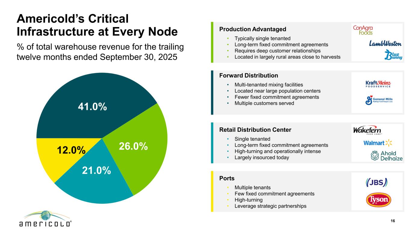 Significant Growth Opportunities in Asia Pacific 15 • Region is 90%+ economically occupied with Same store NOI growing 16% YoY • Specializes in fast turning and operationally intensive retail/QSR business • Decades long relationships • Americold Operating System and Project Orion implemented throughout Production Advantaged Forward Distribution Retail Distribution Port Facilities AMERICOLD ADVANTAGES • Existing customers are growing and requesting additional development support • Expansion into adjacent channels, such as convenience, mass merchandise, e-commerce, drug stores, club stores, and dollar stores • Leverage partnership opportunities in Southeast Asia GROWTH STRATEGY Reconciliations of non-GAAP measures to the most comparable GAAP metrics are included within our quarterly financial supplement for the three and nine months ended September 30, 2025 as filed with the SEC on November 6, 2025