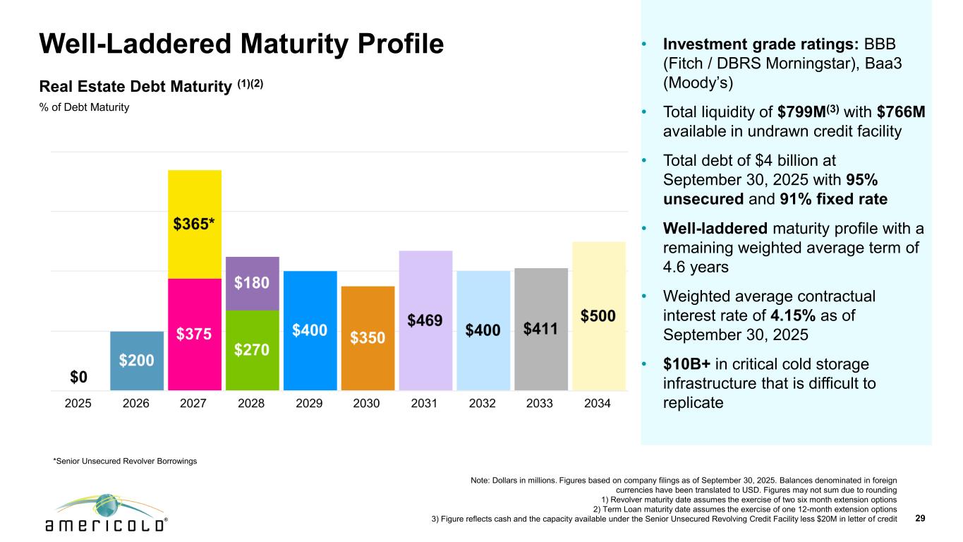 Well-Laddered Maturity Profile Note: Dollars in millions. Figures based on company filings as of September 30, 2025. Balances denominated in foreign currencies have been translated to USD. Figures may not sum due to rounding 1) Revolver maturity date assumes the exercise of two six month extension options 2) Term Loan maturity date assumes the exercise of one 12-month extension options 3) Figure reflects cash and the capacity available under the Senior Unsecured Revolving Credit Facility less $20M in letter of credit 29 Real Estate Debt Maturity (1)(2) % of Debt Maturity *Senior Unsecured Revolver Borrowings • Investment grade ratings: BBB (Fitch / DBRS Morningstar), Baa3 (Moody’s) • Total liquidity of $799M(3) with $766M available in undrawn credit facility • Total debt of $4 billion at September 30, 2025 with 95% unsecured and 91% fixed rate • Well-laddered maturity profile with a remaining weighted average term of 4.6 years • Weighted average contractual interest rate of 4.15% as of September 30, 2025 • $10B+ in critical cold storage infrastructure that is difficult to replicate