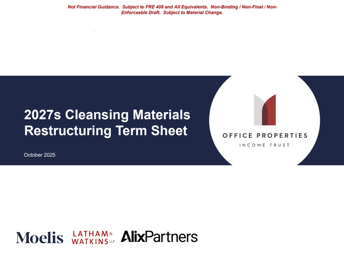 | NOT FINANCIAL GUIDANCE. PROVIDED TO LENDERS FOR DUE DILIGENCE PURPOSES. PRELIMINARY DRAFT. SUBJECT TO SIGNIFICANT CHANGE 1 OFFICE PROPERTIES INCOME TRUST BUSINESS PLAN PRESENTATION August 2025 Chicago, IL NOT FINANCIAL GUIDANCE. PROVIDED TO LENDERS FOR DUE DILIGENCE PURPOSES. PRELIMINARY DRAFT. SUBJECT TO SIGNIFICANT CHANGE |