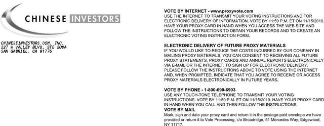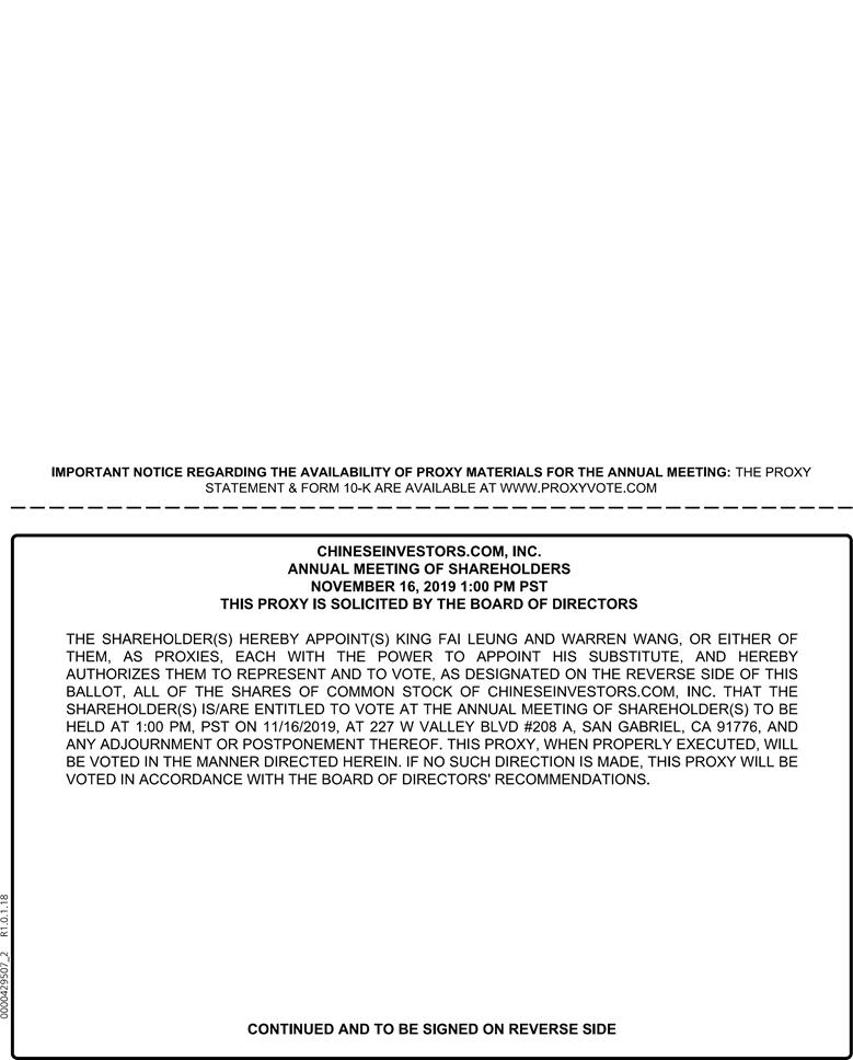 You are cordially invited to attend the 2018-2019 annual stockholders meeting of ChineseInvestors.com Inc., an Indiana corporation, to be held on Saturday, November 16, 2019 at 1:00 p.m.., Pacific Time, in the conference room on the 2nd floor of the office building located at 227 W Valley Blvd. #208 A, San Gabriel, CA 91776, USA.