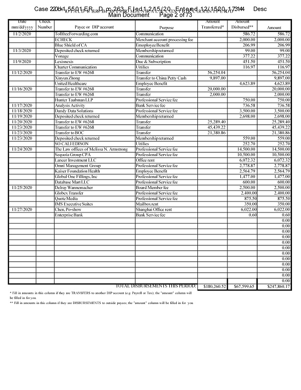 * Fill in amounts in this column if they are TRANSFERS to another DIP account (e.g. Payroll or Tax); the "amount" column will be filled in for you. ** Fill in amounts in this column if they are DISBURSEMENTS to outside payees; the "amount" column will be filled in for you. Date mm/dd/yyyy Check Number Payee or DIP account Purpose Amount Transferred* Amount Disbursed** Amount 11/2/2020 TollfreeForwarding.com Communication 586 . 7 2 586 . 7 2 ECHECK Merchant account processing fee 2 , 000 . 0 0 2 , 000 . 0 0 Blue Shield of CA Emoployee Benefit 206 . 9 9 206 . 9 9 11/3/2020 Deposited check returned Membership returned 99 . 0 0 99 . 0 0 Vonage Communication 377 . 2 2 377 . 2 2 11/9/2020 Lexisnexis Due & Subscription 451 . 5 0 451 . 5 0 Charter Communication Uitilies 116 . 9 7 116 . 9 7 11/12/2020 Transfer to EW #6268 Transfer 56 , 254 . 0 4 56 , 254 . 0 4 Xinyun Zhong Transfer to China Petty Cash 9 , 897 . 0 0 9 , 897 . 0 0 United Healthcare Employee Benefit 4 , 623 . 8 9 4 , 623 . 8 9 11/16/2020 Transfer to EW #6268 Transfer 20 , 000 . 0 0 20 , 000 . 0 0 Transfer to EW #6268 Transfer 2 , 000 . 0 0 2 , 000 . 0 0 Hunter Taubman LLP Professional Service fee 750 . 0 0 750 . 0 0 11/17/2020 Analysis Activity Bank Service fee 736 . 5 8 736 . 5 8 11/18/2020 Dandy Data Solutions Professional Service fee 3 , 500 . 0 0 3 , 500 . 0 0 11/19/2020 Deposited check returned Membership returned 2 , 698 . 0 0 2 , 698 . 0 0 11/20/2020 Transfer to EW #6268 Transfer 25 , 289 . 4 0 25 , 289 . 4 0 11/23/2020 Transfer to EW #6268 Transfer 45 , 439 . 2 2 45 , 439 . 2 2 11/23/2020 Transfer to BOC Transfer 21 , 380 . 8 6 21 , 380 . 8 6 11/23/2020 Deposited check returned Membership returned 559 . 0 0 559 . 0 0 SO CALI EDISON Uitilies 252 . 7 0 252 . 7 0 11/24/2020 The Law offices of Melissa N. Armstrong Professional Service fee 14 , 500 . 0 0 14 , 500 . 0 0 Sequoia Group CPA Professional Service fee 10 , 500 . 0 0 10 , 500 . 0 0 Lancer Investment LLC Office rent 6 , 072 . 3 2 6 , 072 . 3 2 Omni Management Group Professional Service fee 2 , 778 . 8 7 2 , 778 . 8 7 Kaiser Foundation Health Employee Benefit 2 , 564 . 7 9 2 , 564 . 7 9 Global One Fillings, Inc Professional Service fee 1 , 477 . 0 0 1 , 477 . 0 0 Database Mart LLC Professional Service fee 600 . 0 0 600 . 0 0 11/25/2020 Delray Wannemacher Board Member fee 2 , 500 . 0 0 2 , 500 . 0 0 Globex Transfer Professional Service fee 2 , 400 . 0 0 2 , 400 . 0 0 Quote Media Professional Service fee 875 . 5 0 875 . 5 0 IMS Executive Suites Mailbox rent 350 . 0 0 350 . 0 0 11/27/2020 Chen, Po - show Shanghai Office rent 6 , 022 . 0 0 6 , 022 . 0 0 Enterprise Bank Bank Service fee 0 . 6 0 0 . 6 0 0 . 0 0 0 . 0 0 0 . 0 0 0 . 0 0 0 . 0 0 0 . 0 0 0 . 0 0 0 . 0 0 0 . 0 0 0 . 0 0 0 . 0 0 0 . 0 0 TOTAL DISBURSEMENTS THIS PERIOD: $180 , 260 . 5 2 $67,599.65 $247 , 860 . 1 7 Case 2:20 - bk - 1 TO 5 T 5 A 0 L 1 D - E IS R BURS D EM oc EN 2 T 6 S 3 FRO F M il G e E d N 1 ER 2 A /1 L 5 A / C 2 C 0 OUN E T n F t O e R re C d UR 1 R 2 E / N 1 T 5 P /2 E 0 RIO 1 D 7:31:44 Desc Main Document Page 2 of 73