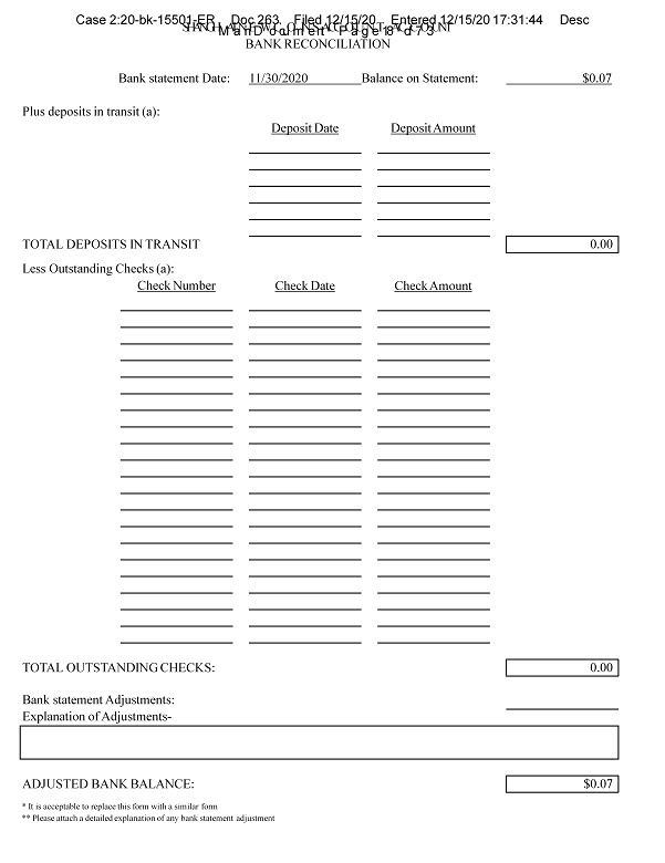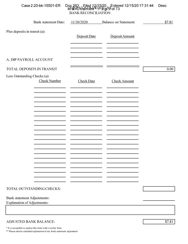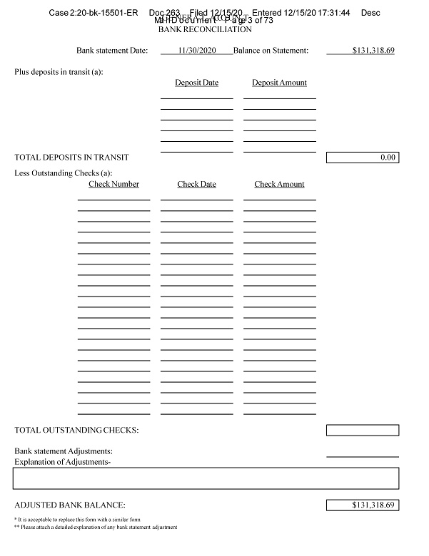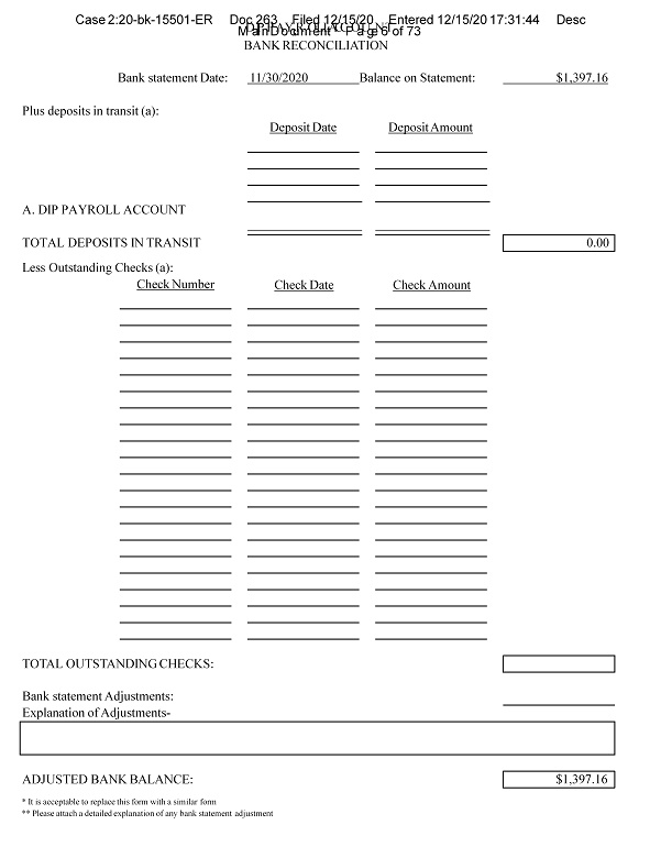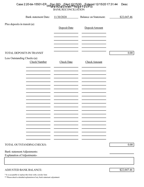 Bank statement Date: 11/30/2020 Balance on Statement: $22,047.46 Plus deposits in transit (a): Deposit Date Deposit Amount 0.00 TOTAL DEPOSITS IN TRANSIT Less Outstanding Checks (a): Check Number Check Date Check Amount TOTAL OUTSTANDING CHECKS: 0.00 Bank statement Adjustments: Explanation of Adjustments - $22,047.46 ADJUSTED BANK BALANCE: * It is acceptable to replace this form with a similar form ** Please attach a detailed explanation of any bank statement adjustment Case 2:20 - bk - 15501 - ER Doc 263 Filed 12/15/20 Entered 12/15/20 17:31:44 Desc BAN M K ai O n F D C oc H u IN m A en C t ASH Pa A g C e C 1 O 2 U o N f T 73 BANK RECONCILIATION