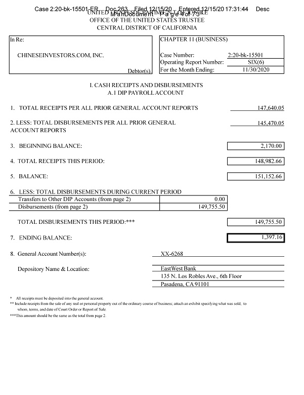 In Re: CHINESEINVESTORS.COM, INC. D e bto r( s ) . 8. General Account Number(s): XX - 6268 Depository Name & Location: EastWest Bank 135 N. Los Robles Ave., 6th Floor Pasadena, CA 91101 * All receipts must be deposited into the general account. ** Include receipts from the sale of any real or personal property out of the ordinary course of business; attach an exhibit specifying what was sold, to whom, terms, and date of Court Order or Report of Sale. ***This amount should be the same as the total from page 2. I. CASH RECEIPTS AND DISBURSEMENTS A.1 DIP PAYROLL ACCOUNT CHAPTER 11 (BUSINESS) Case Number: 2:20 - bk - 15501 Operating Report Number: For the Month Ending: SIX(6) 11/30/2020 1. TOTAL RECEIPTS PER ALL PRIOR GENERAL ACCOUNT REPORTS 147,640.05 2. LESS: TOTAL DISBURSEMENTS PER ALL PRIOR GENERAL ACCOUNT REPORTS 145,470.05 3. BEGINNING BALANCE: 2,170.00 4. TOTAL RECEIPTS THIS PERIOD: 148,982.66 5. BALANCE: 151,152.66 6. LESS: TOTAL DISBURSEMENTS DURING CURRENT PERIOD T ra ns fer s to Oth e r D I P A cc ounts (fr om p a g e 2) 0.00 Disbu r s e m e nts (fr om p a g e 2) 149,755.50 TOTAL DISBURSEMENTS THIS PERIOD:*** 149,755.50 7. ENDING BALANCE: 1,397.16 Case 2:20 - bk - 15501 - ER Doc 263 Filed 12/15/20 Entered 12/15/20 17:31:44 Desc UNITED M ST a A in T D E o S c D u E m P e A n R t TM P E a N g T e O 4 F o J f U 7 S 3 TICE OFFICE OF THE UNITED STATES TRUSTEE CENTRAL DISTRICT OF CALIFORNIA